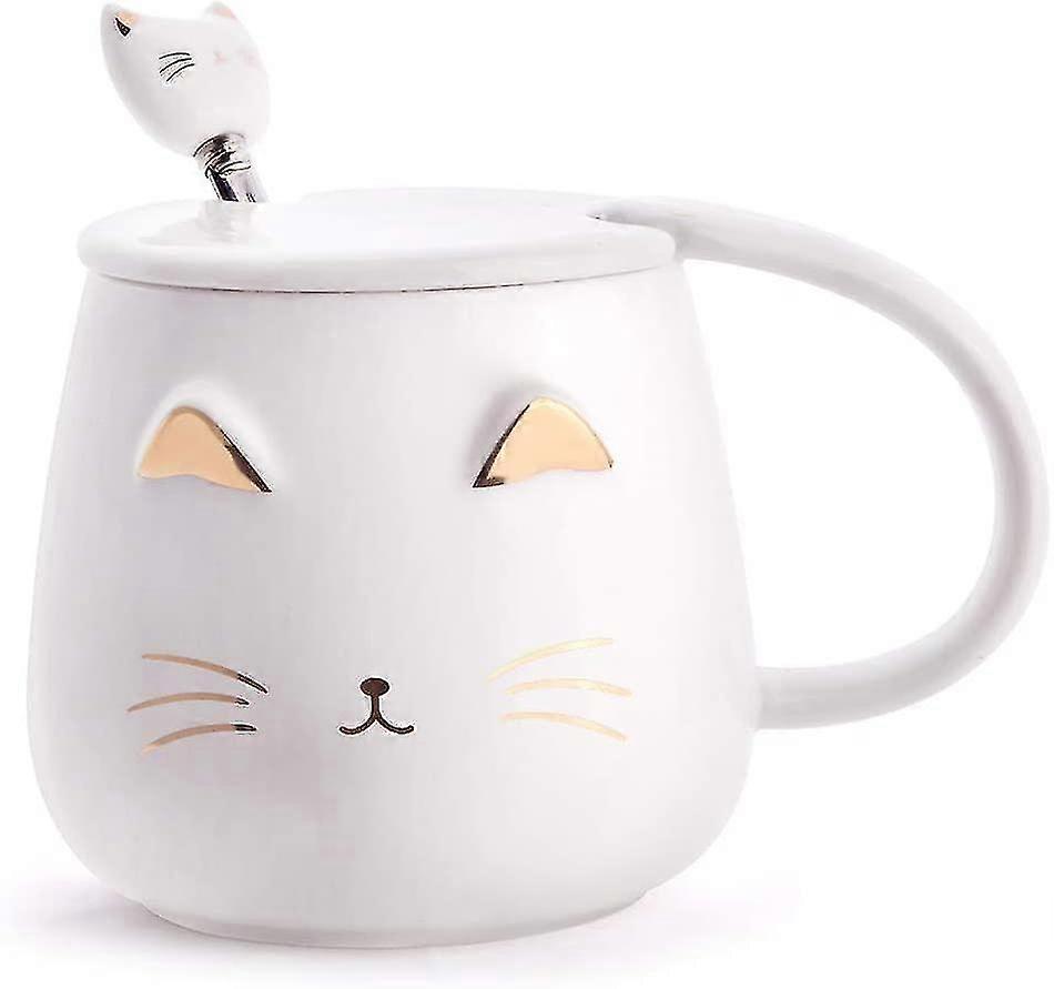 White Ceramic Coffee Mug with Stainless Steel Spoon, Cute Kitty Pattern