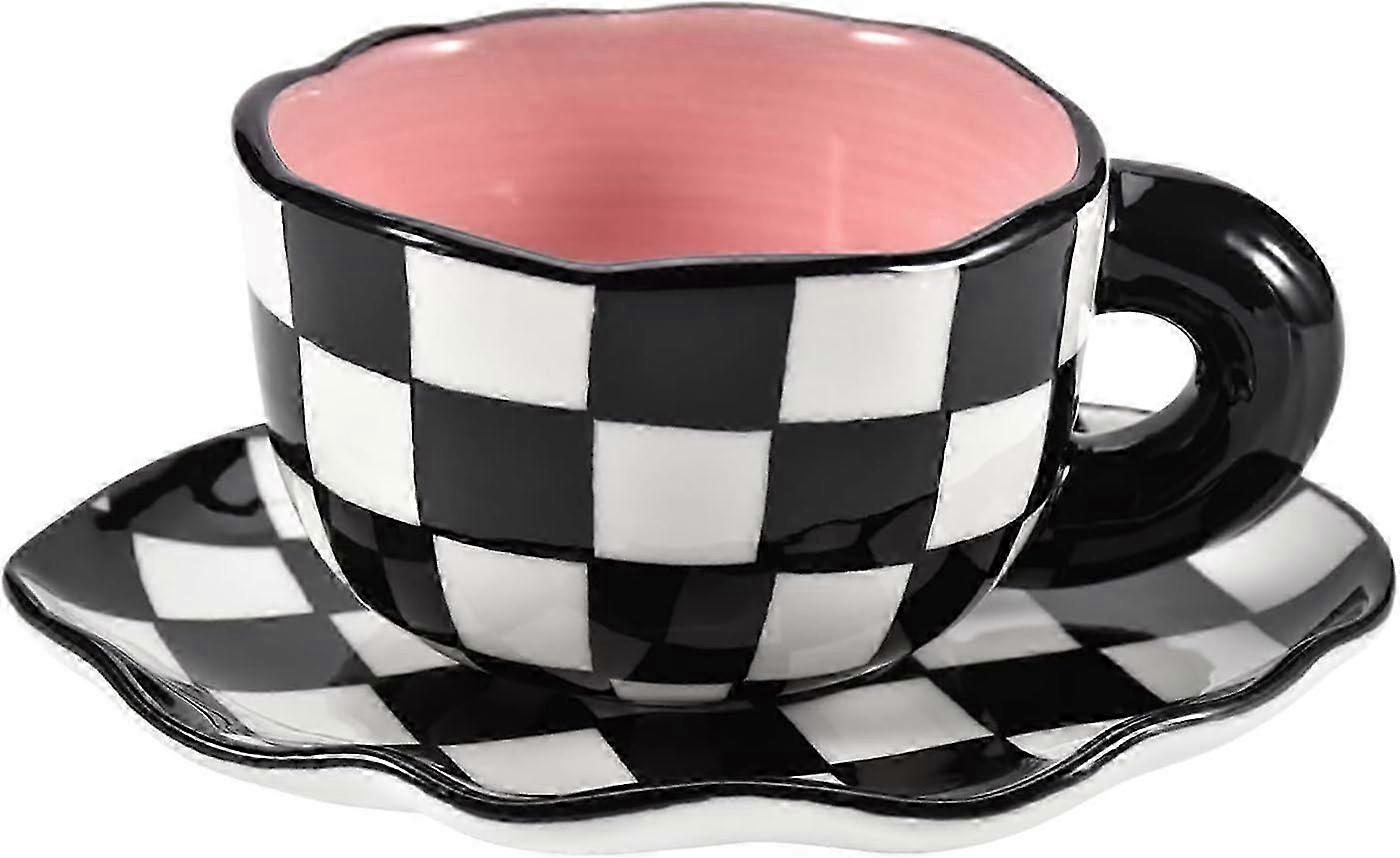 Ceramic Coffee Checkered Mug with Saucer Set, Cute Creative Unique Irregular Saucer Design for Office and Home, Dishwasher and Microwave Safe, 6 oz/18