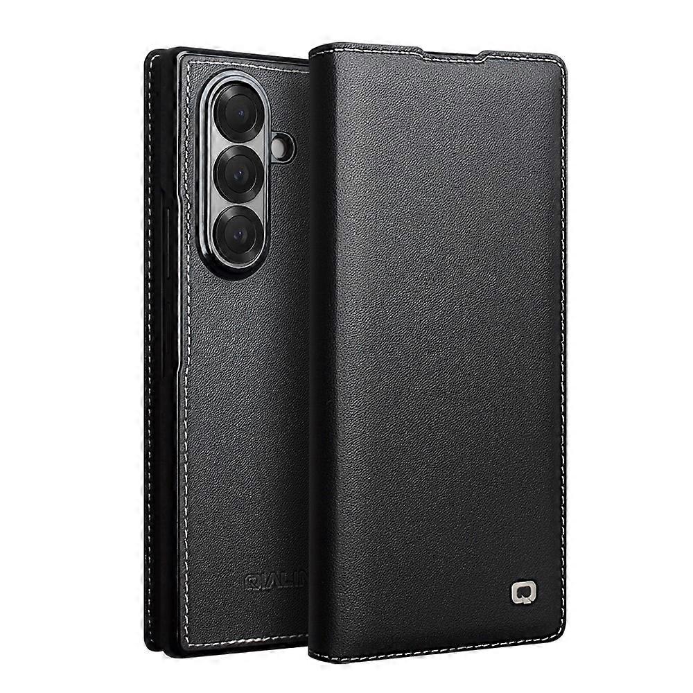 QIALINO Compatible For Samsung Galaxy Z Fold7 5G Case Genuine Cow Leather Flip Phone Cover, Black