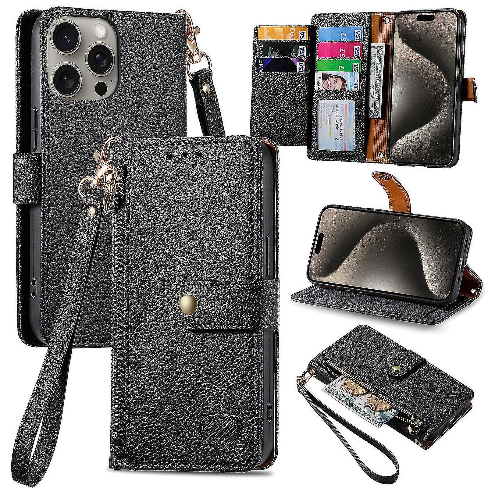 For iPhone 15 Pro Wallet Case RFID Blocking Zipper Pocket Phone Leather Cover