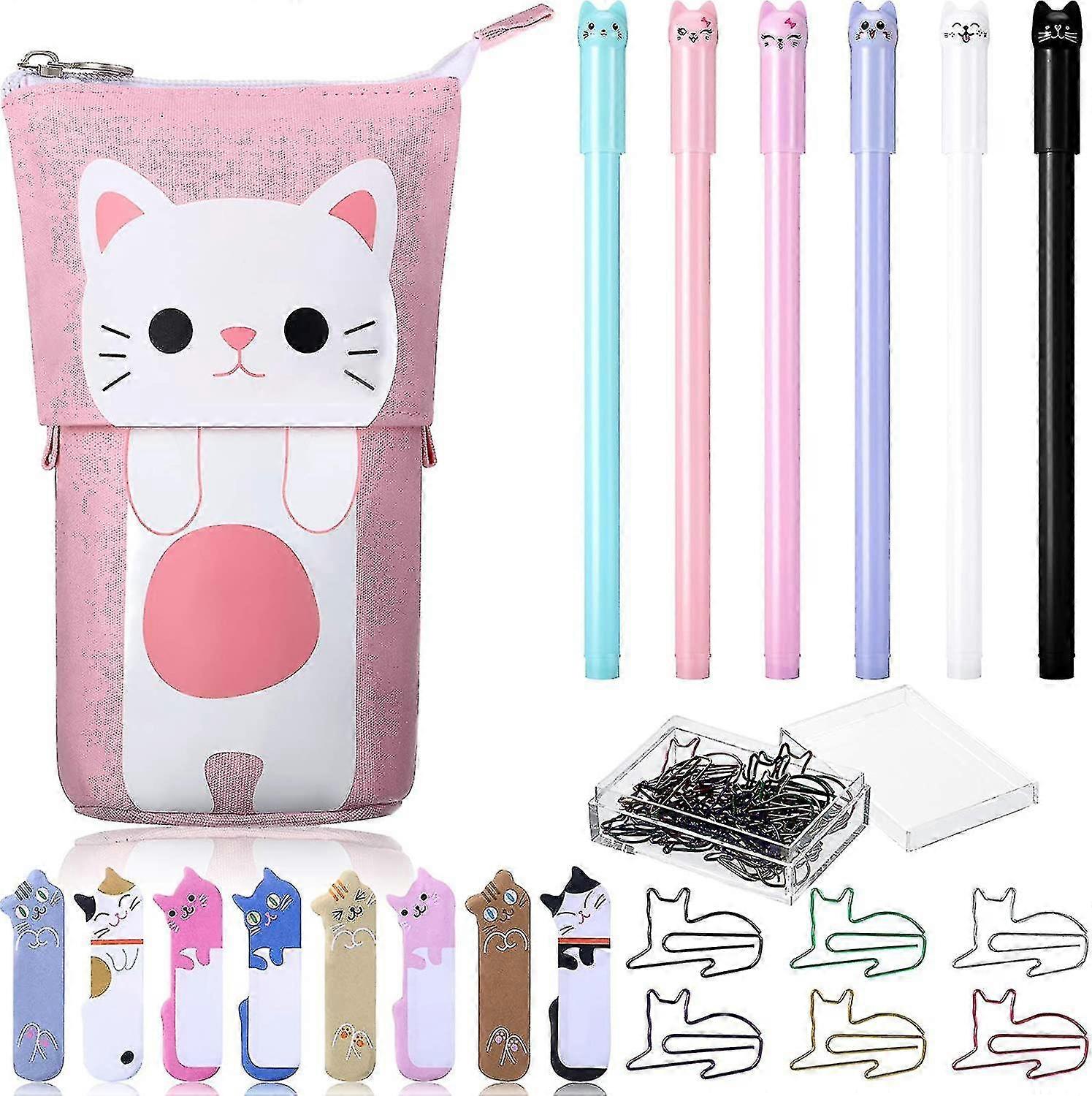 Cute Cat Stationery Set, 1 Canvas Telescopic Pen Holder Transformer Pencil Case, 6 Colorful Cat Black Gel Ink Pens, 30 Cat Shaped Paper Clips Bookmark