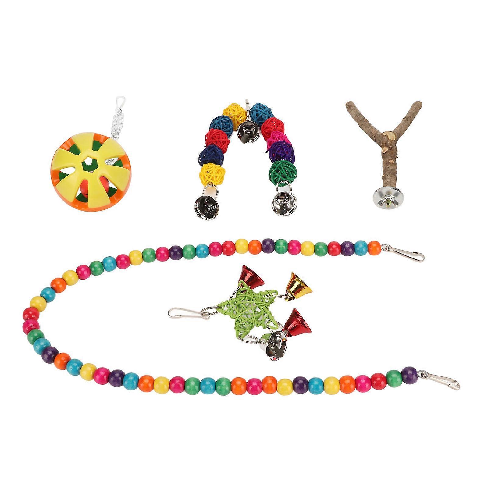 Feature: 1. VIBRANT COLORS: Birds cage toys have bright colors that will quickly grab your little bird's attention. The bell toy will attract your little bird to play and chew. 2. IDEAL PLACE TO RELAX: Parrot swing toys are ideal for your pet bird to swing, play, climb and chew. The bell rope and cane ball bite will make your pet bird love it. 3. EXERCISE BIRD'S BODY: Parrot swing chewing toy can exercise your bird's body, enhance physical fitness, improve immunity and prevent depression in birds. 4. SAFE MATERIAL: Hanging bell birds cage toys are made of natural wood, colored wood beads and food coloring dye, durable, non toxic, hygienic and safe. 5. EASY TO INSTALL: Bird parrot swing chewing toys are easy to install with a movable hook that simply attaches to the top of your pet's cage. Specification: Item Type: Parrot Swing Chewing Toy Material: Log, ABS. Package List: 1 x Bird Stand Stick1 x Bell Ball1 x Rattan Ball Bell Skewer1 x Pentagram Rattan Ball Bell Skewer1 x Beaded Suspension Bridge Note: Part of the accessories color random