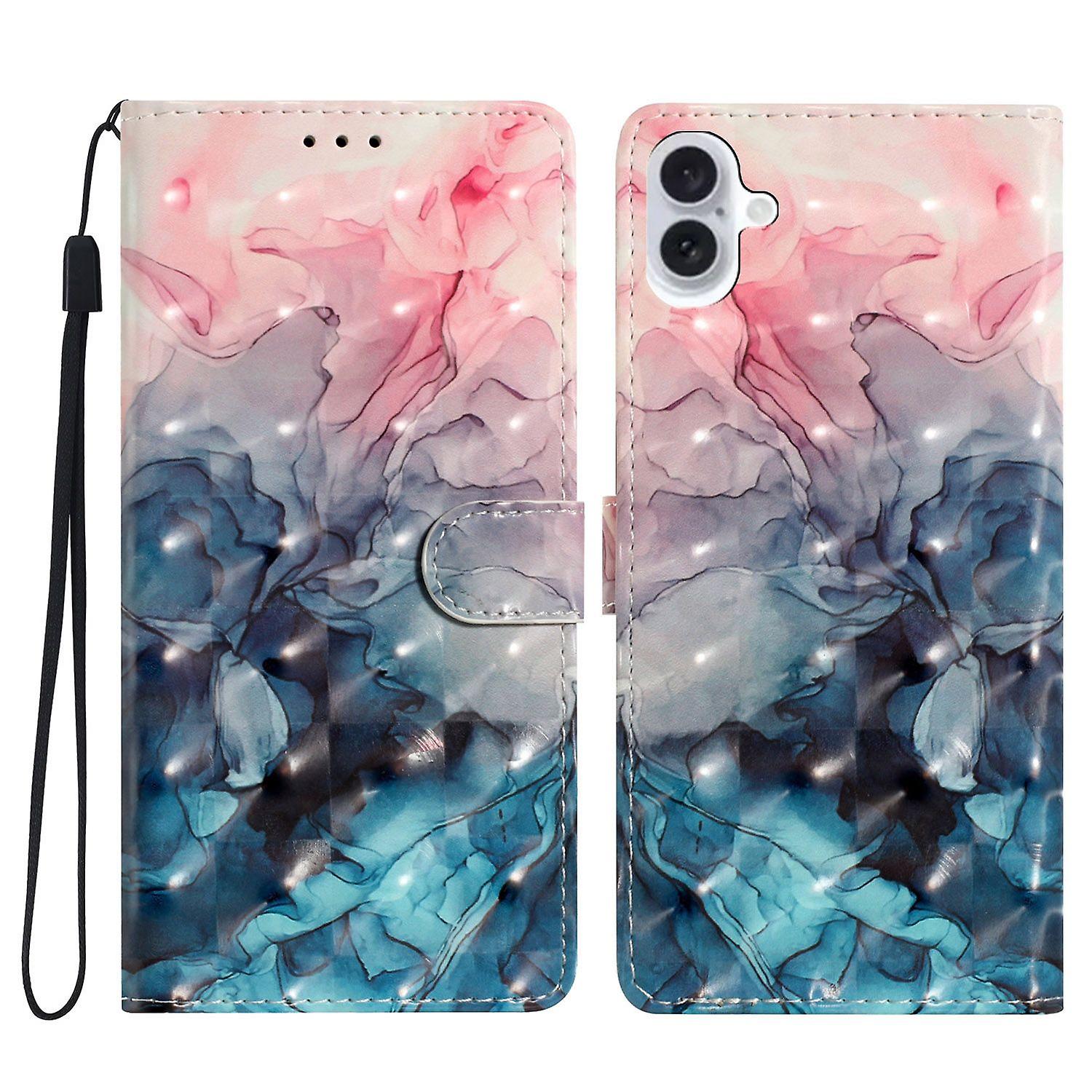 For iPhone 16 Plus Case PU Leather 3D Pattern Printing Wallet Phone Cover - Pink Blue Marble