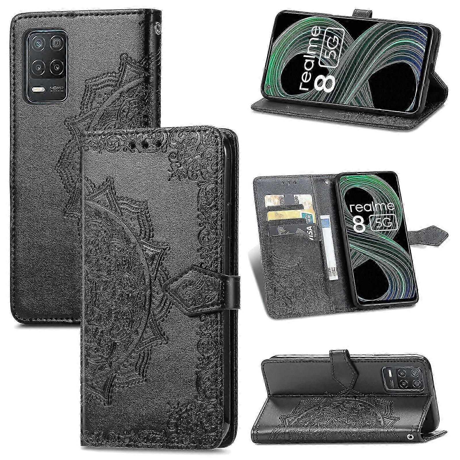 For OPPO Realme 8 5G Mandala Flower Embossed Horizontal Flip Leather Case with Holder & Three Card Slots & Wallet & Lanyard(Black)