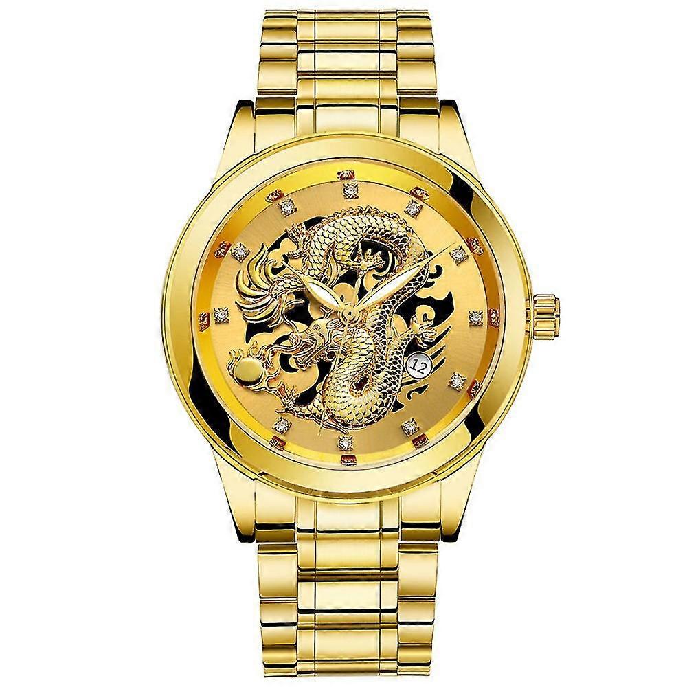 Waterproof Mens Gold Dragon Sculpture Quartz Watch Luxury Men Steel Wristwatch