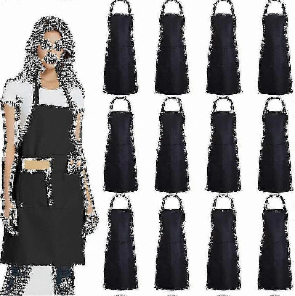 Bulk 12-Pack Unisex Black Aprons with Dual Pockets for Kitchen and Work Use
