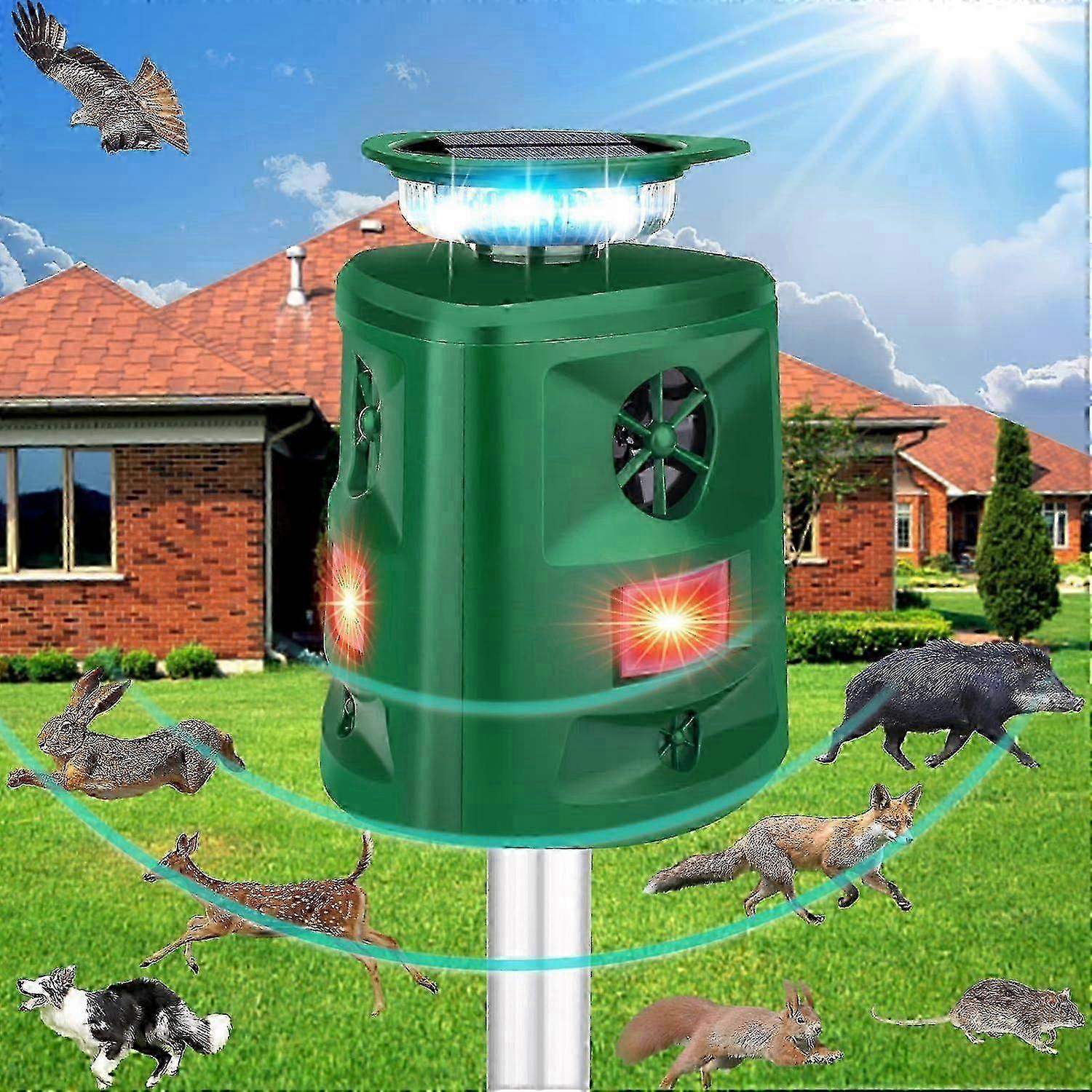 Human & Environment Friendly Animal Solar RepellerAre you tired of animals invading destroying your home and garden?This garden repellent for animals is humane ,human cannot heard ultrasonic waves ,only animals will be influenced, solar powered animal repeller safe,physically repelling,solar animal repeller with motion sensor protect your family and nature. Five Operation Modes Animal RepellerThe animal repellent outdoor has 5-level function adjustment,1: Ultrasonic horn alarm sound drive, 2: The ultrasonic horn emits bird calls of repelling,3: Ultrasonic +blue and white light strobe light,4: The ultrasonic horn emits owl calls mode of repelling,5: Infrared blue and white LED light night mode, cycle mode with all functions from 1-5 gears, until the animal is driven out of the inductior range.Different frequencies repel different animals. Solar & Waterproof Ultrasonic Animal Repellent Animal repellent ultrasonic outdoor with solar panel on the top can convert sunlight into power to ensure the durable operations of the ultrasonic bird repeller outdoor,rabbit repeller also can be charged with included USB cable ,raccoon repellent ultrasonic features solid construction and IP44 waterproof design,which can protect itself against normal rain, snow, or the harsh sun,you can use rabbit repeller in any weather conditions. Upgraded Design 360 Ultrasonic Animal RepellerSolar powered ultrasonic animal repeller is different from the traditional animal repeller, animal repellent ultrasonic outdoor consists of 3 sides, ultrasonic cat repellent each side has an infrared sensor thus, can sense the small movements of invasive animals up to 30 feet away in a 360 range,features state of the art ultrasonic technology at the same time by an alarm sound and flash lights,scare them away from your house, garden, yard. Portable & Easy To Use Solar Ultrasonic Animal Repeller Animal repeller portable and small size ,simply insert the solar ultrasonic repeller into the appropriate soil where the light touches and turn on for functioning,maintenance-free operation,animal repellent outdoor portable to take into your camping to be away from wild animal harassment.Contact us for full money back or a new replacement if any issue caused. We are ready to help within 24 hours with satisfied solution.