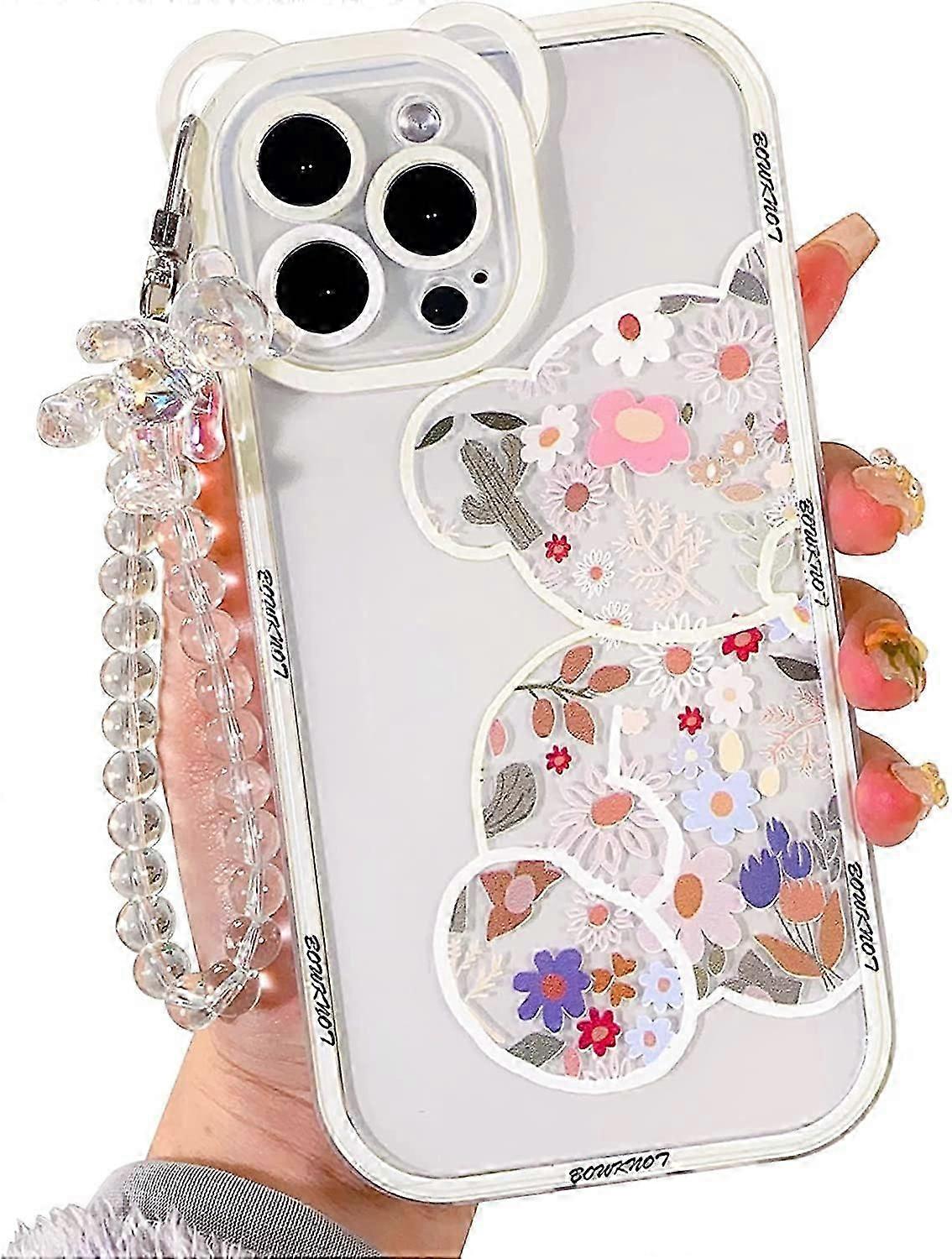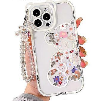 Compatible for iPhone 14 Pro Max Case, Cute Floral Bear Camera Lens Case for Women Girls, Soft TPU Shockproof Protective Cover with Lovely Flower Brac