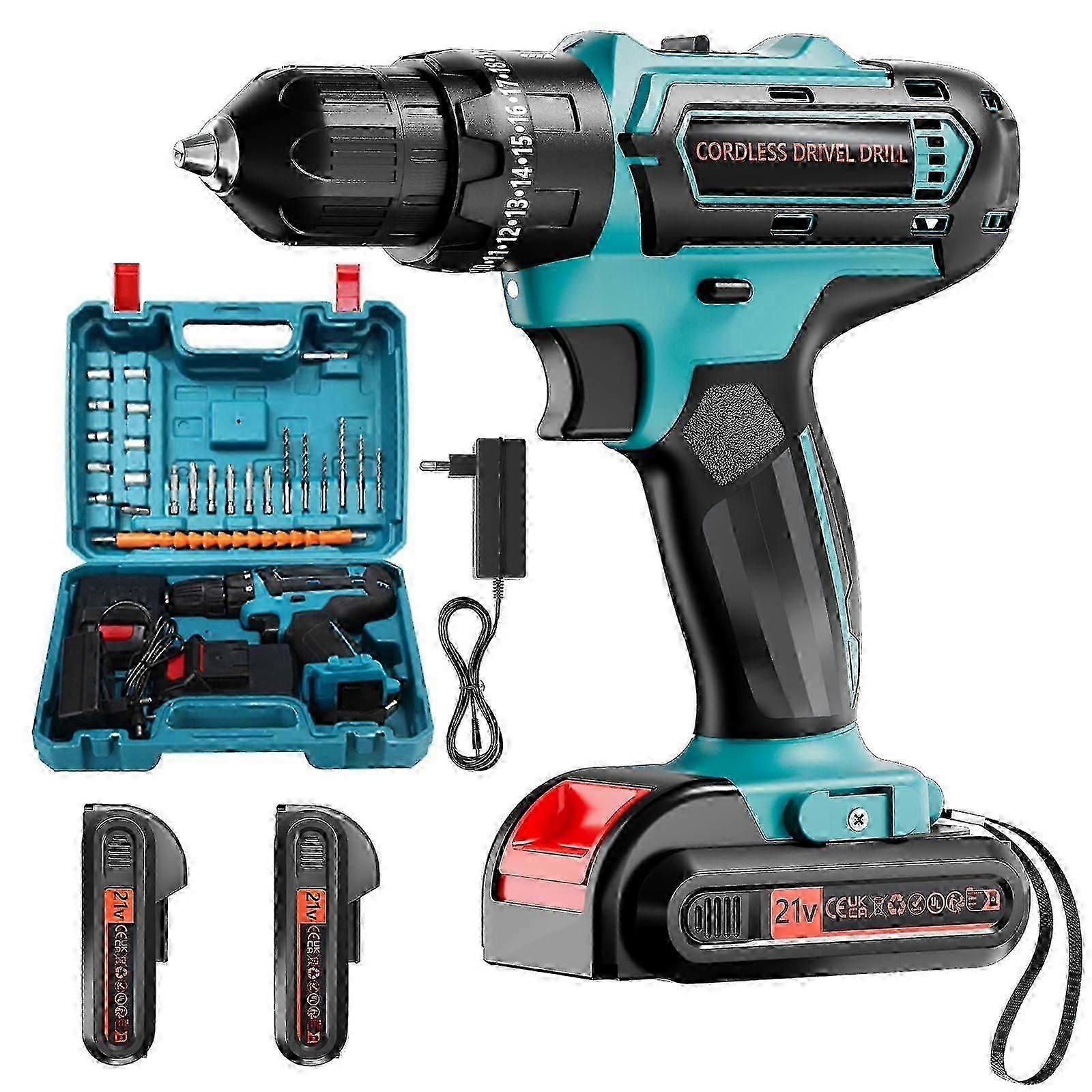 21V Cordless Drill with 2Battery and Charger, Electric drill Set, Power Drill with 3/8 Inch Chuck