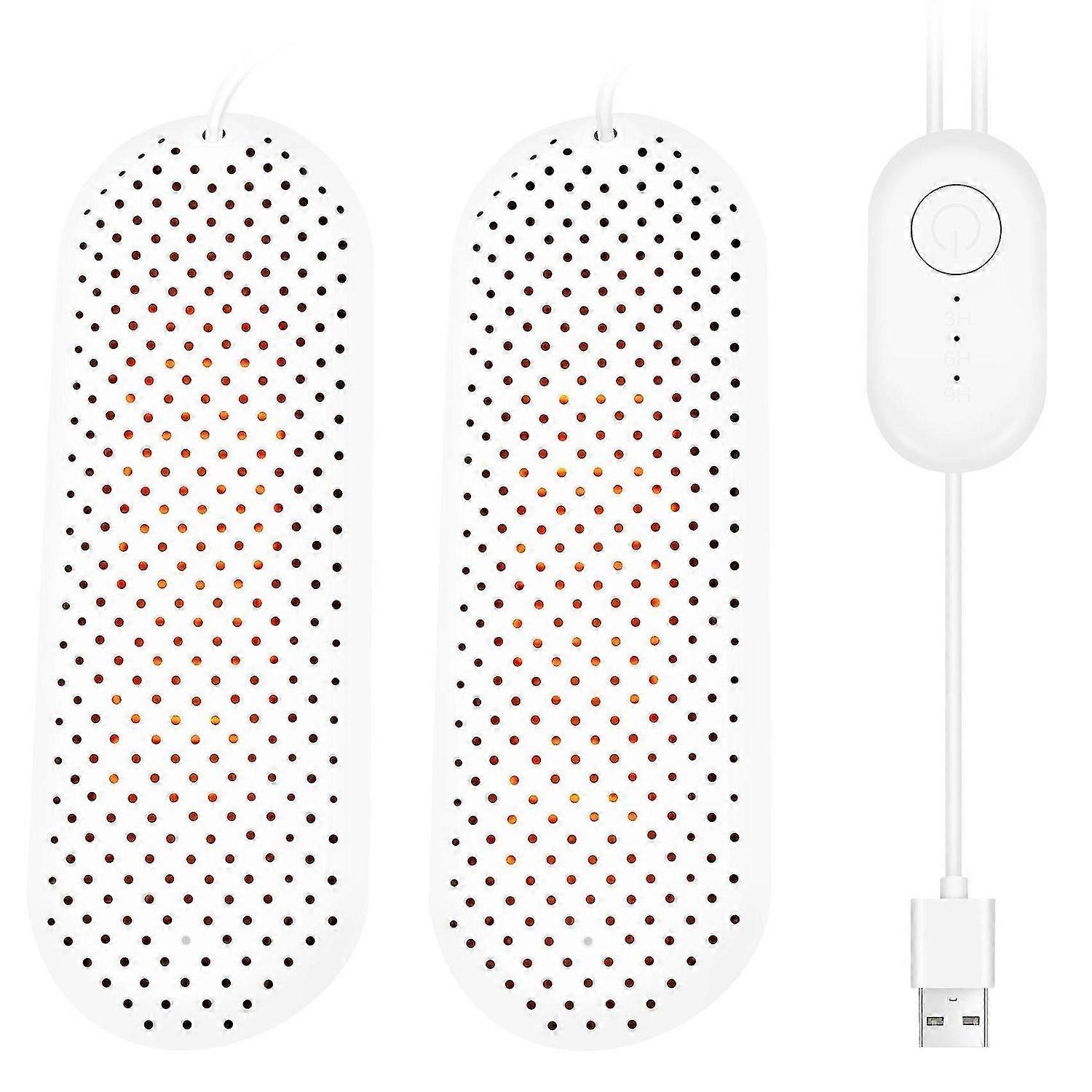 Features: 1. Three-in-one shoe dryer: drying + antibacterial + warming shoes, fast drying shoes, sterilization, deodorization, dehumidification, prevention of athlete's foot, care for the health of the whole family's feet. 2. Porous heat dissipation, 360° surround, no dead spots for drying, keeping the temperature inside the shoes, moisture absorption and sterilization, making your shoes dry and comfortable. 3. Three-speed timing, constant temperature heating, for shoes of different materials and thickness, dry shoes quickly without harming the shoes. [unique function of the timing model] 4. Ultraviolet light sterilization: destroy the living environment of bacteria, take away peculiar smell, inhibit the growth of microorganisms, achieve sterilization and remove peculiar smell. [Unique function of the purple lampmodel]<br><br>USB universal interface, low power and low voltage, automatic constant temperature is safer. (Note: The recommended current is higher than 2A.) The extended cord allows the shoe dryer to be placed deeper in various types of shoes, and the heating area is wide and even. Specifications: Material: ABS Color: White Size: 18 x 6.3cm Rated voltage: DC5V Rated current: 2A Maximum power: 10W Temperature: 55℃-65℃ Power interface: USB Function: drying shoes, three-speed timing,ultraviolet sterilization Timing for drying shoes: 3/6/9 hours<br><br>Package Contents: 1 pair x Shoe Dryer<br><br>Only the above package content, other products are not included. Note: Light reflection and different displays may cause the color of the item in the picture a little different from the real thing. The measurement allowed error is +/- 1-3cm.