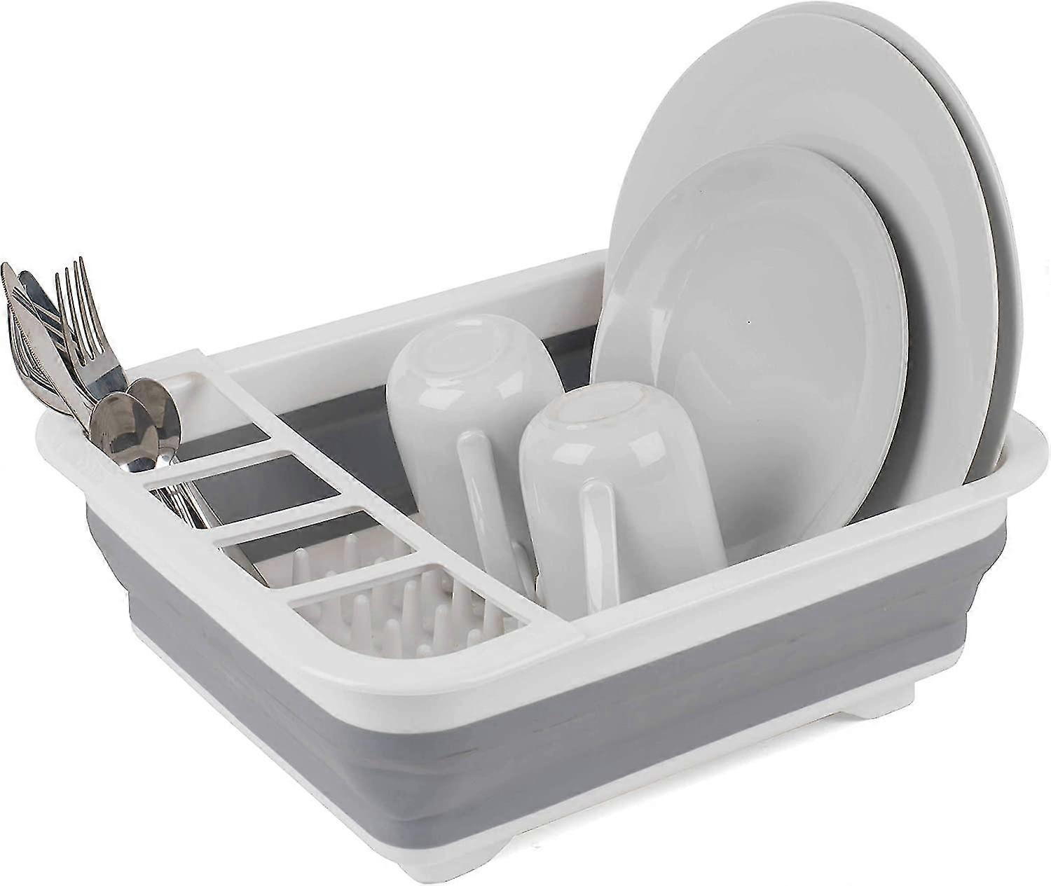 grey collapsible dish drainer with cutlery divider, perfect for homeowners or camping, break resistant, space saving design