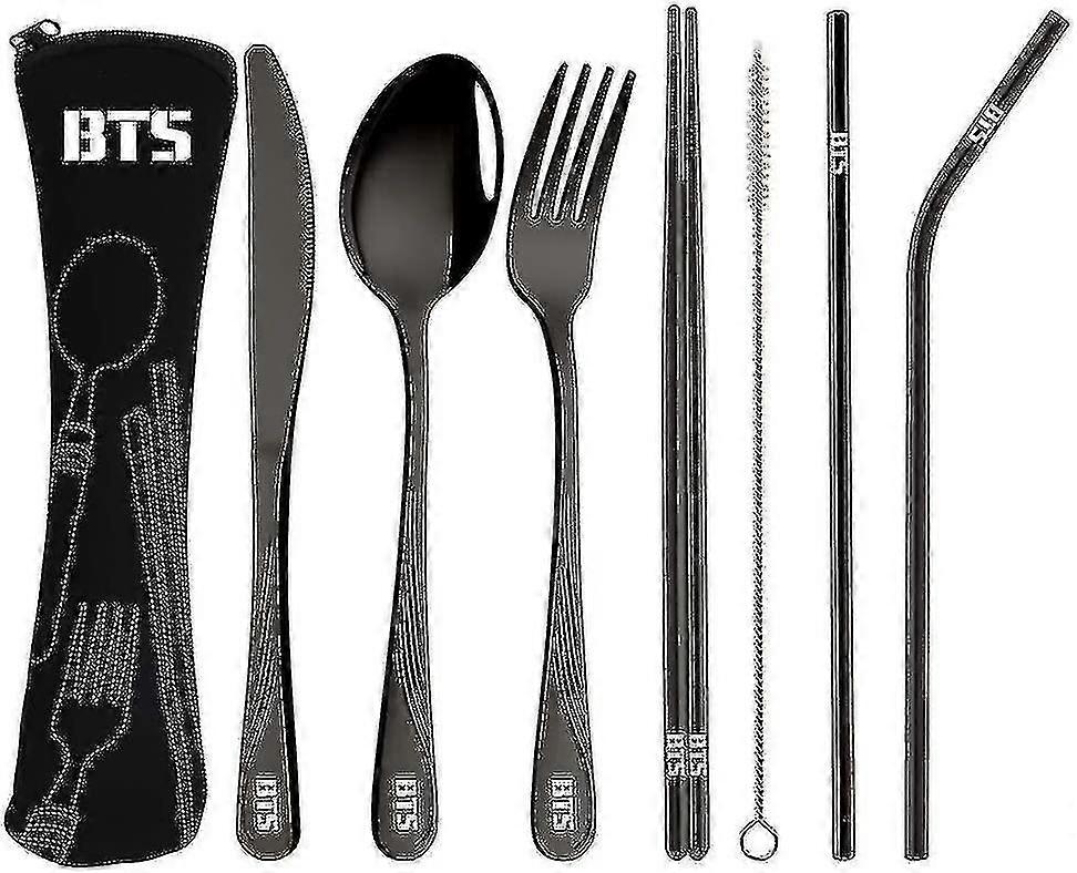 Portable Lunch Cutlery Set - Straw, Straight Straw, Knife, Compatible Withk, Spoon, Chopsticks, Cleaning Brush Set Of 8 Kpop Bts Items Bangtan Boys It