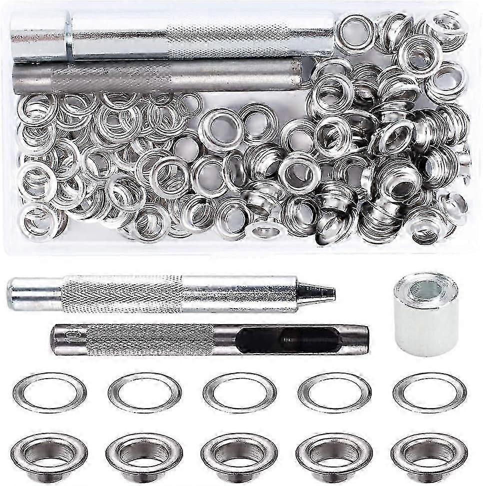 Easy to use Simple attachment of tarpaulin eyelets with the appropriate hole cutter and mandrel. The characteristic pattern on the surface of the mandrel is roughened to prevent slipping and provide a secure grip With a plastic storage boxAll these rivet sets and tools are packed in a transparent storage box with removable baffles, which helps you find the right components and saves time QualityThese tarp eyelets are made of sturdy metal and are resistant to corrosion and rust. 8mm inner diameter1/3inch), outer diameter 14mm0.55inch), height 4mm. Useful ToolsThese durable paper eyelet tools are easy to use and suitable for denim, canvas, tarpaulin, tents, awnings and other fabric items. Package ItemsThe grommet kit set includes a hole punch, a matching chuck and 100 sets of eyelets (each set contains 1 eyelet and 1 washer) and a storage box.