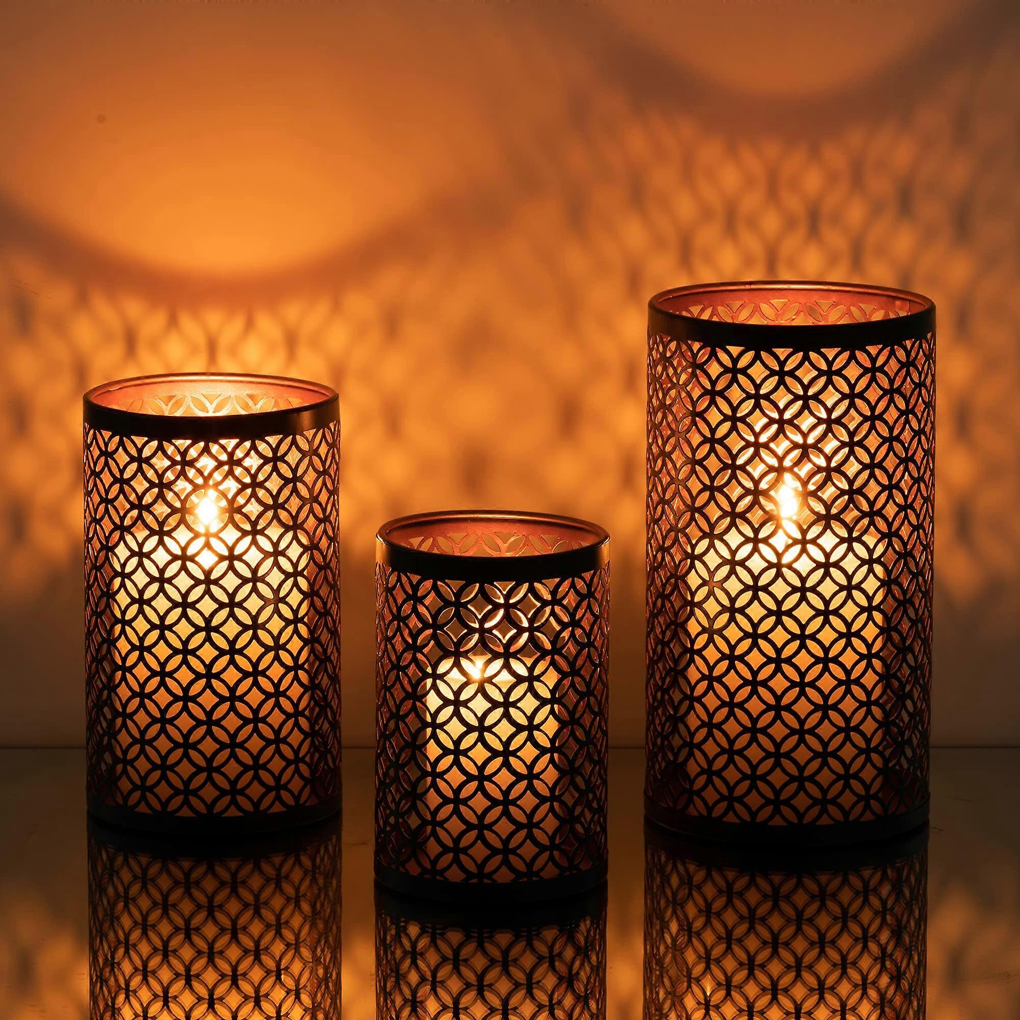 【Unique Hollow Out Design】Through the hollow carvings, warm light of the candle reflects beautiful shadows around, create a relaxing and romantic ambiance for your home. 【Stylish Candleholder Set】The hollow out copper candle holder set with assorted size, made of high quality metal and painted with exquisite gold & black coating, easy to match your home decoration style. 【Wide Range of Applications】the universal size hurricane candleholder set not only fits for different kinds of candles (pillar, votive, tealight, LED Flameless candle) , but also be use as a decorative ornament to display anything you like 【Measurement】3 assorted size available, Large :11cm/4.3”×20cm/8” ,Medium: 10cm/4”× 16cm/6.3”, Small 8.5cm/3.4” × 12.7cm/5” ( W×H), fits for pillar, votive, tealight and LED Flameless candle 【Cross-occasion Use】A great home decoration for different styles and themes, such as modern, vintage, rustic, easy to incorporate into your mantel, coffee table, dinning table, shelf and garden. Also perfect for parties, weddings or any other special event.