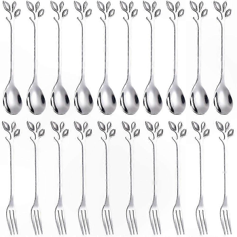 20-Piece Dessert Fork and Spoon Set, 4.7 Inch Silver Leaf Cake Forks and Coffee Spoons, Stainless Steel Fruit Forks (10 Spoons + 10 Forks)