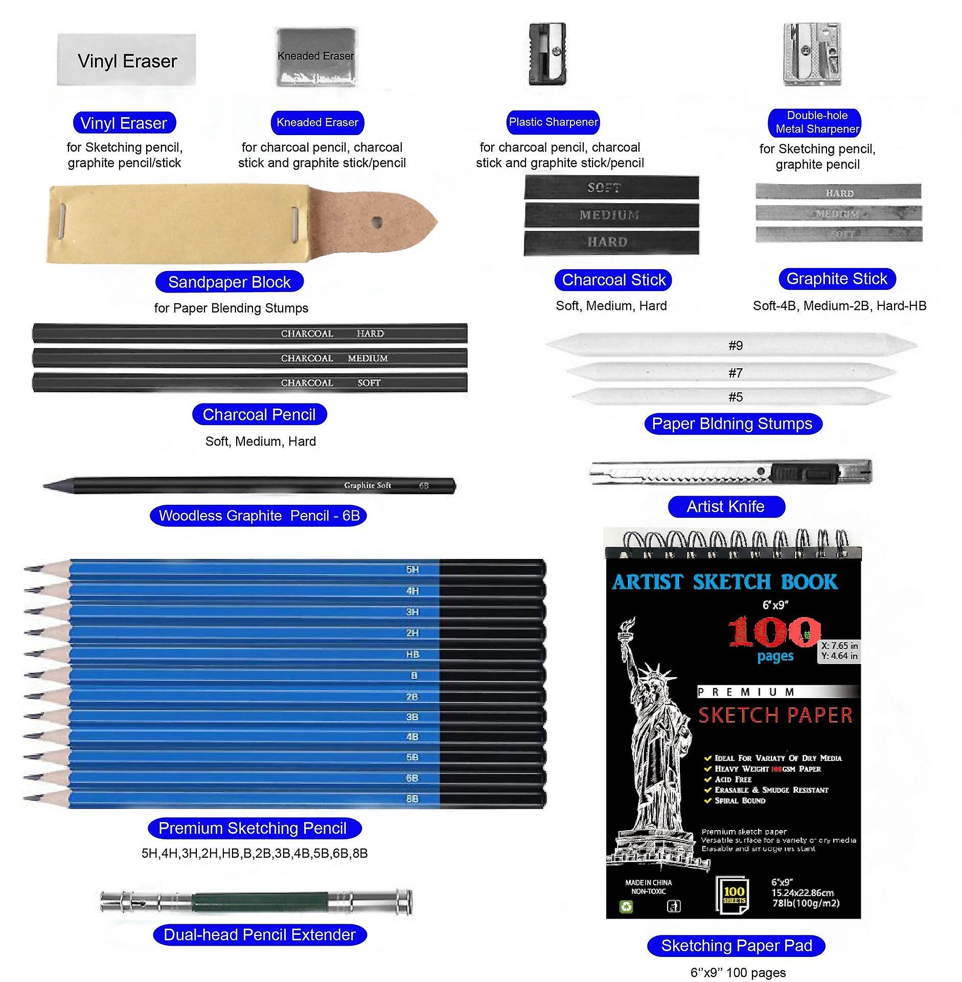 Drawing Pencil Set Of 34 Pieces Plus Sketchbook Art Tools