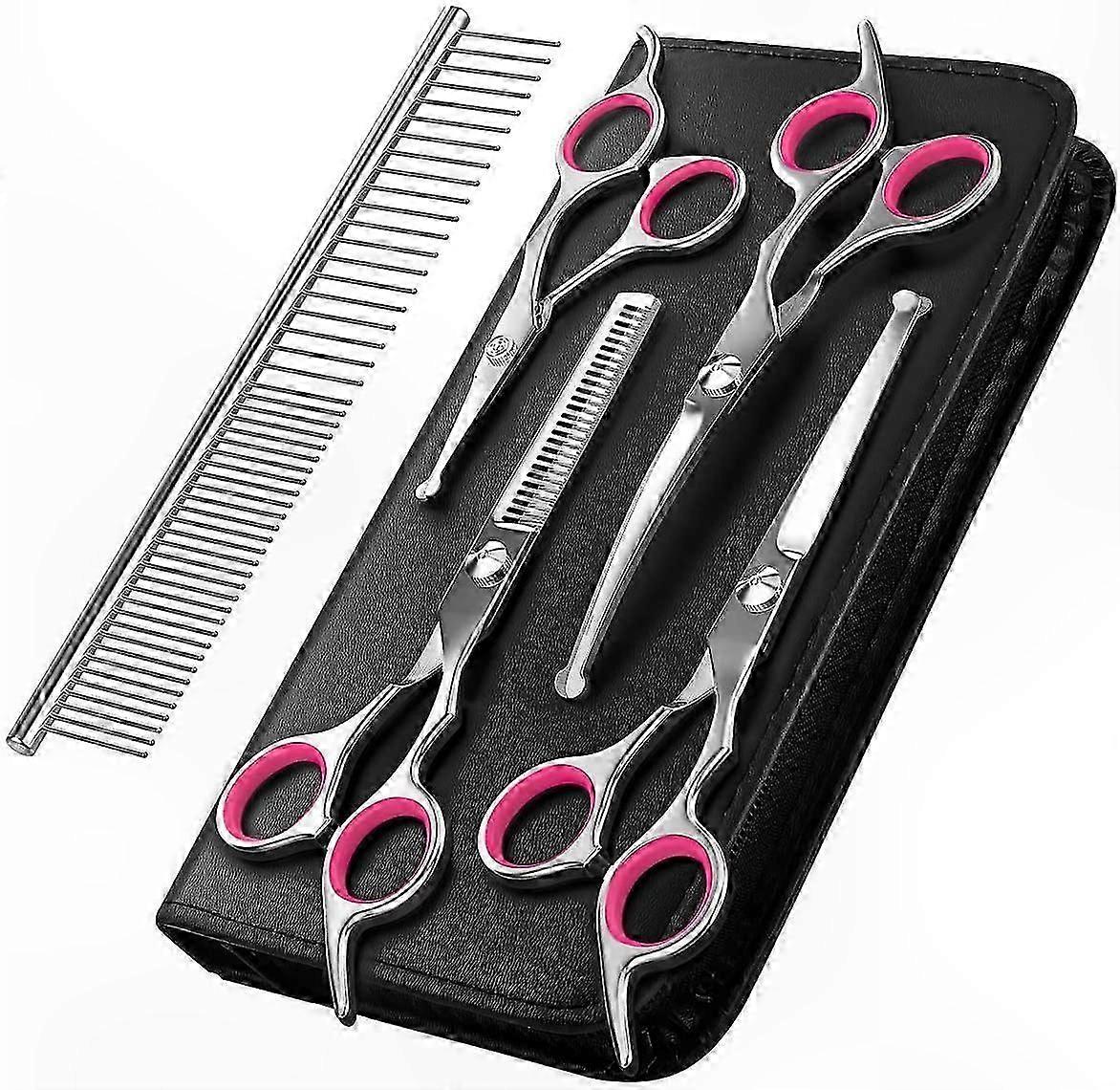 Pet Grooming Scissors Set, 5-Piece Stainless Steel Thinning and Straight Shears with Comb, Titanium Coated Pink Tool Kit