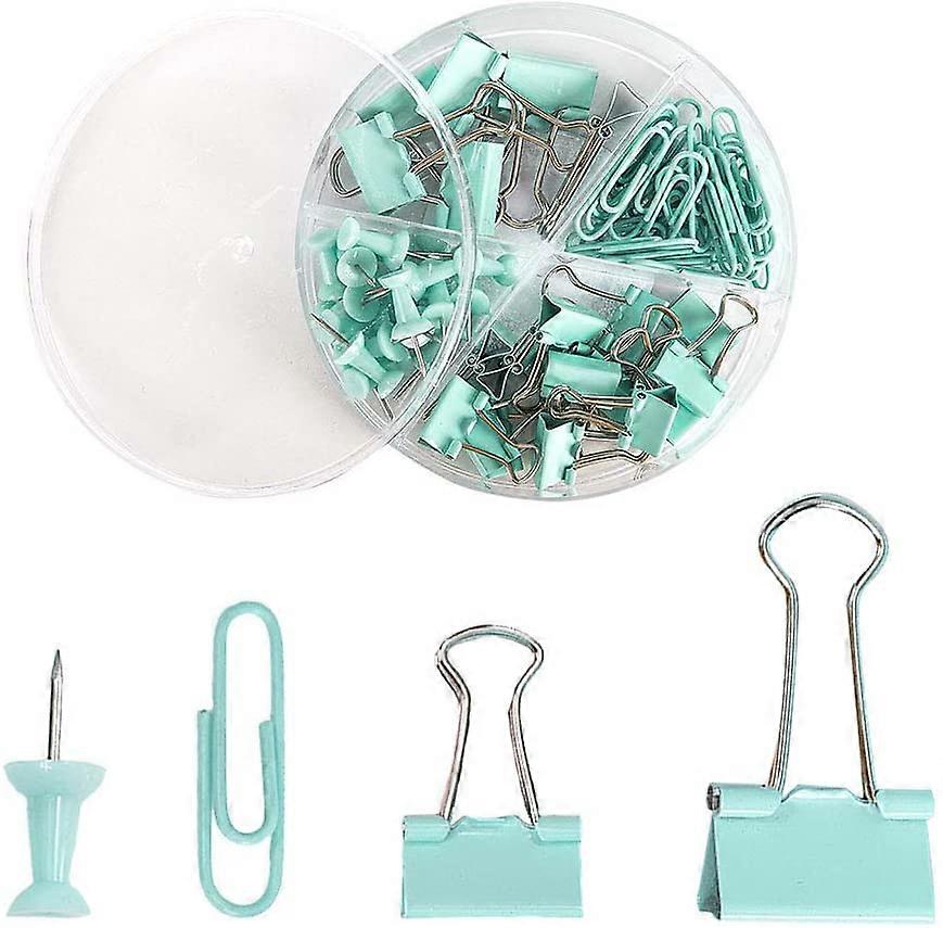 72 PiecesOur package including 7 piececs 13.8inch binder clips,15 pieces 0.79 inches binder clips,30 pieces paper clips,20 pieces push pins,pink and blue color you can choose for your meet. Packed in a reusable clear acrylic box to keep your desktop or your desk drawer organized.MaterialMade of advanced nickel plating technology, durable, anti-rust and reusable. Packed in a clear acrylic box with 4 separated zone to keep organized well, it also can collect other small items.Easy to UseClips keep large stacks of loose paper securely fastened together, without the risk of slipping or falling out. Can be easily removed with a pinch of the arms for full access to documents at any time.Multi-PurposeBinder Clips and Paper Clips are ideal for holding papers, notes, receipts, bookmark, files, tickets, other small items etc. Push pins Use to pin important messages on any bulletin board, cork board, foam board, map and more.