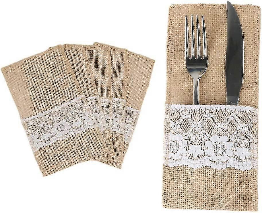 Set Of 10 Natural Jute Cutlery Bags, Jute With Lace Knife Bags, Cutlery Bags For Wedding/YY