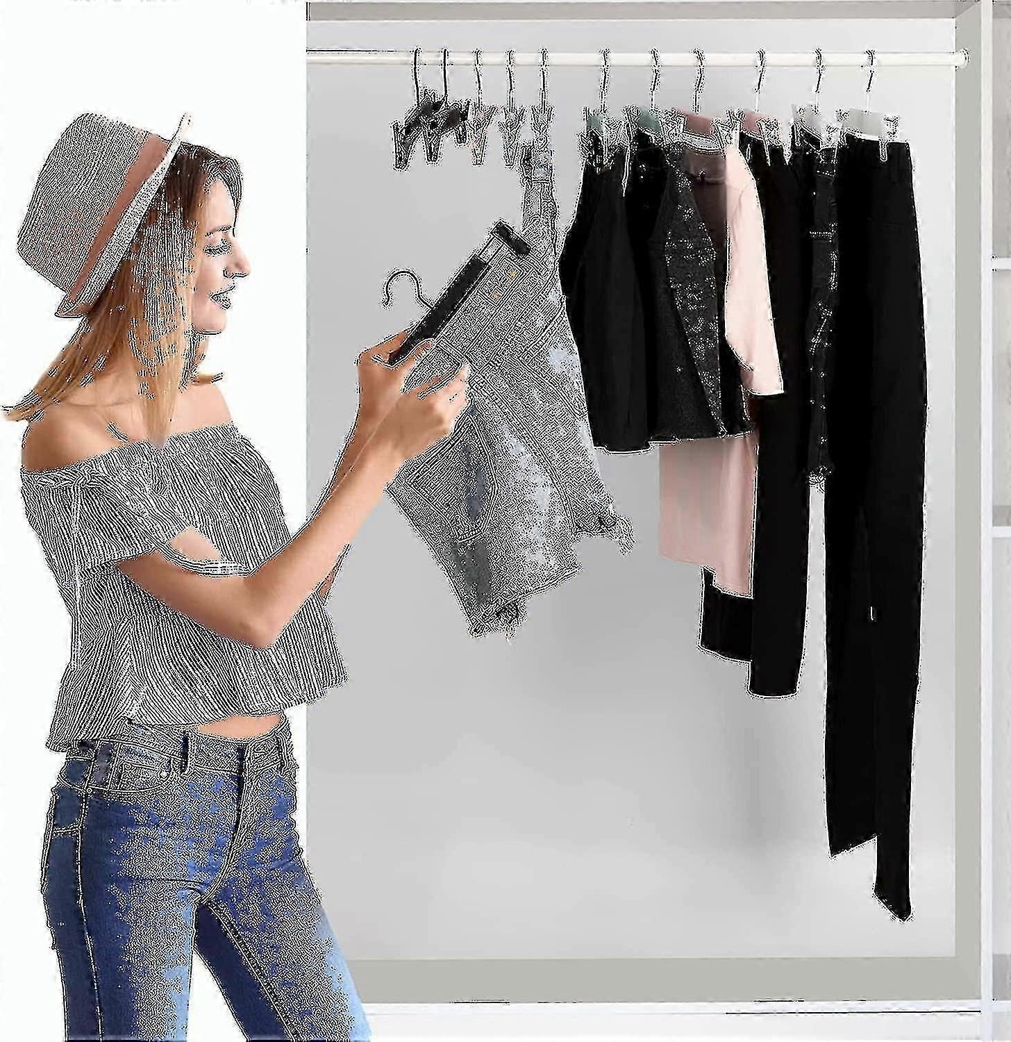 Premium Material- Our trouser rack is made of high quality plastic and sturdy metal wire for durability and practicality. Carry heavy loads strong enough to easily hang clothes.Excellent Design- The hanger has two detachable clips which can be adjusted from 21cm to 28cm. Different sizes for adults and teenagers. In addition, the clip has an anti-slip design, which can tie your clothes and prevent falling.Suitable for- Suitable for skirts, pants, jeans, socks, skirts, pants, work pants, maxis, leggings and shorts, scarves , kids clothes or adult clothes.The Size- Each hanger measures 29 x 3 x 13.5cm / 12 x 1.2 x 5.3inch (LxWxH), total length is 12inch. 1. High quality plastic materials, sturdy and durable2. Adjustable clip to fit different clothes 3. Leaves no traces and avoids creases in clothes4. Save space and keep the closet tidy When shopping, please pay attention to the size and dimensions of the product to ensure that it meets your needs. In the title and , we have provided detailed information about the product, including its features and specifications We want you to be completely satisfied with your purchase, so if you have any questions or concerns, please don""""""""t hesitate to contact us. We are here to help and will do our best to assist you. Thank you for choosing our product. We hope you enjoy it