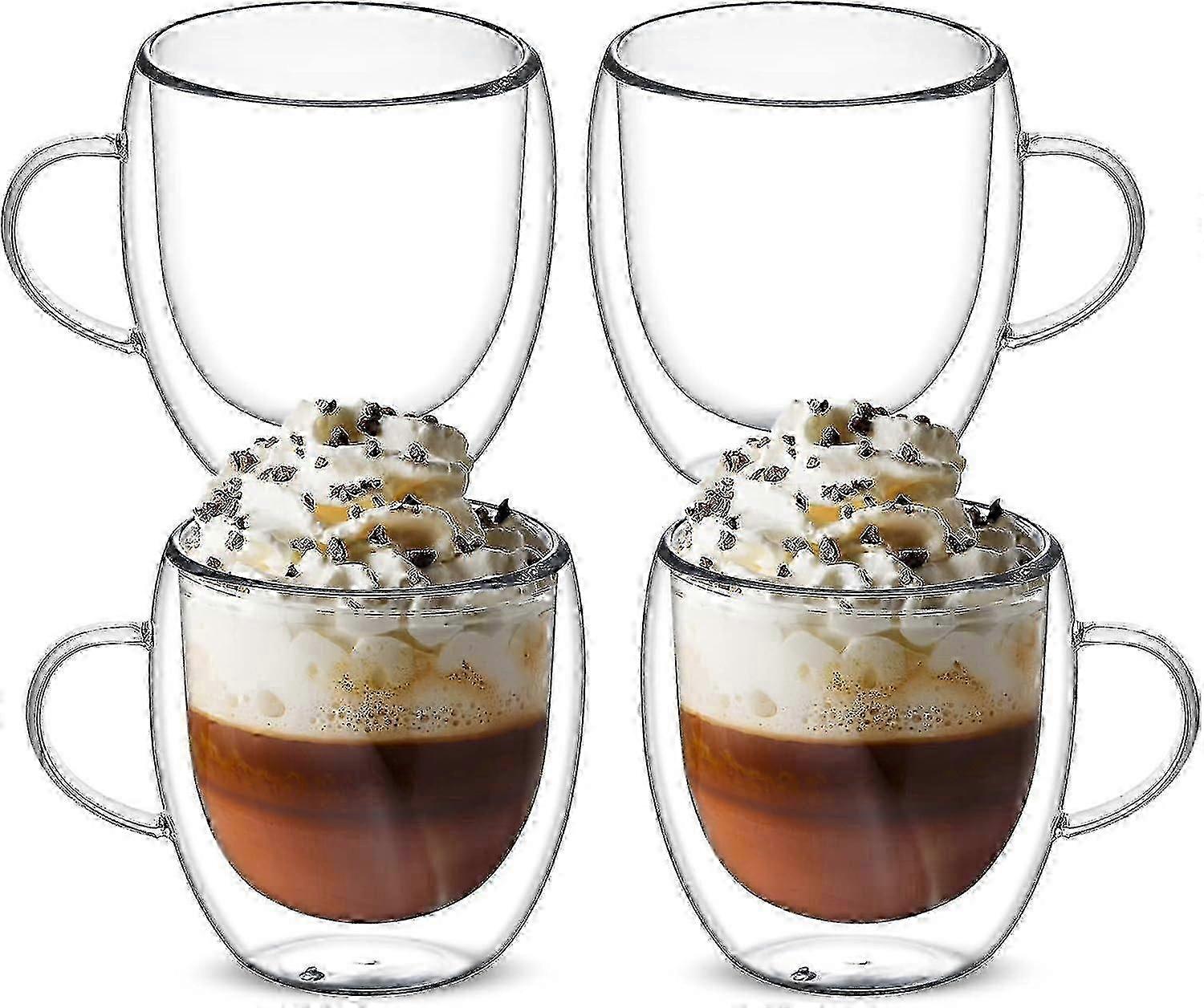 Set of 4 Double Walled Glass Mugs with Handle Insulated Layer Clear Coffee Drinking Cups