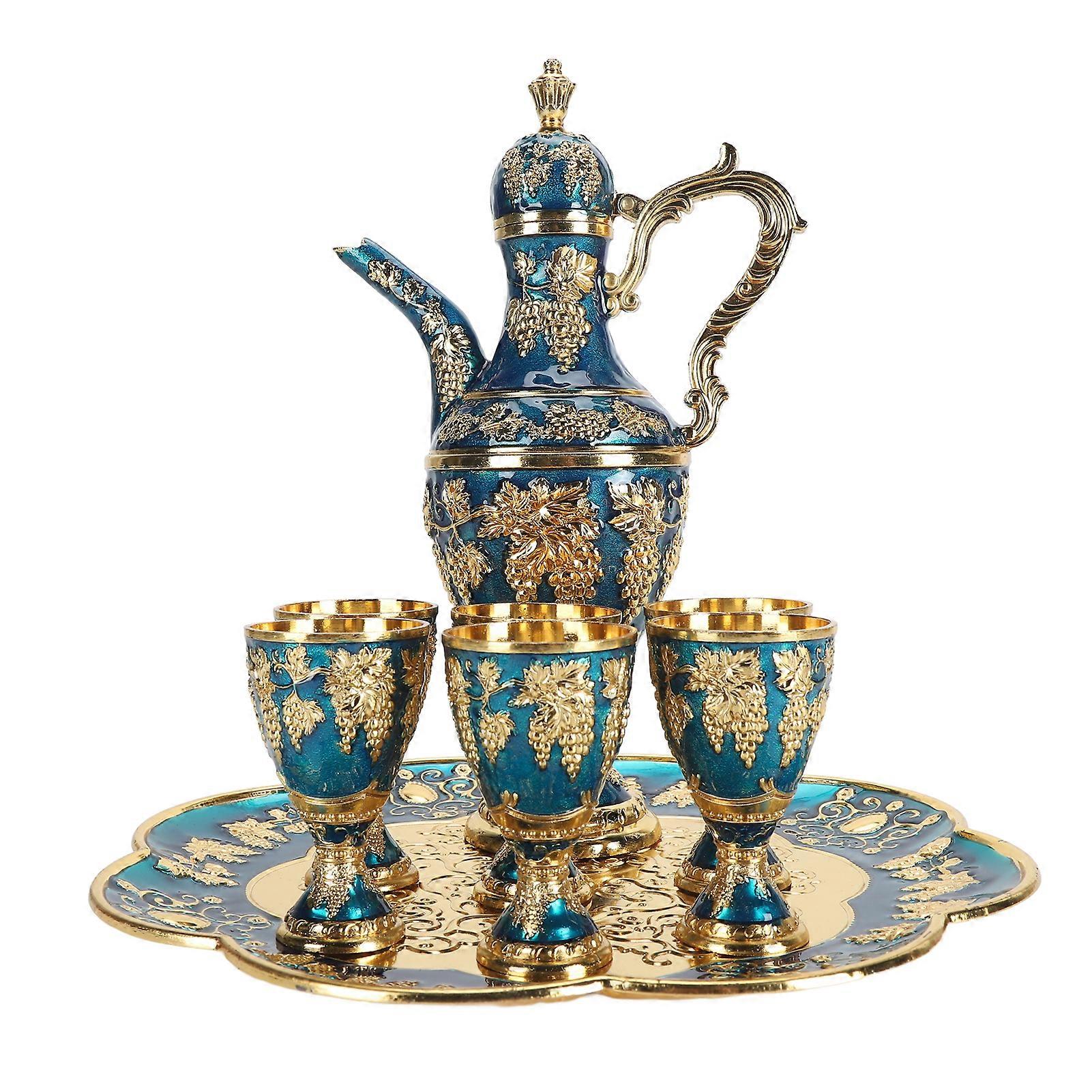 Metal Wine Pot Kit Rustproof Waterproof Zinc Alloy Coffee Pot Set Decorative Exquisite Vintage Pot Tray Set for Daily Party Banquets Gold Blue