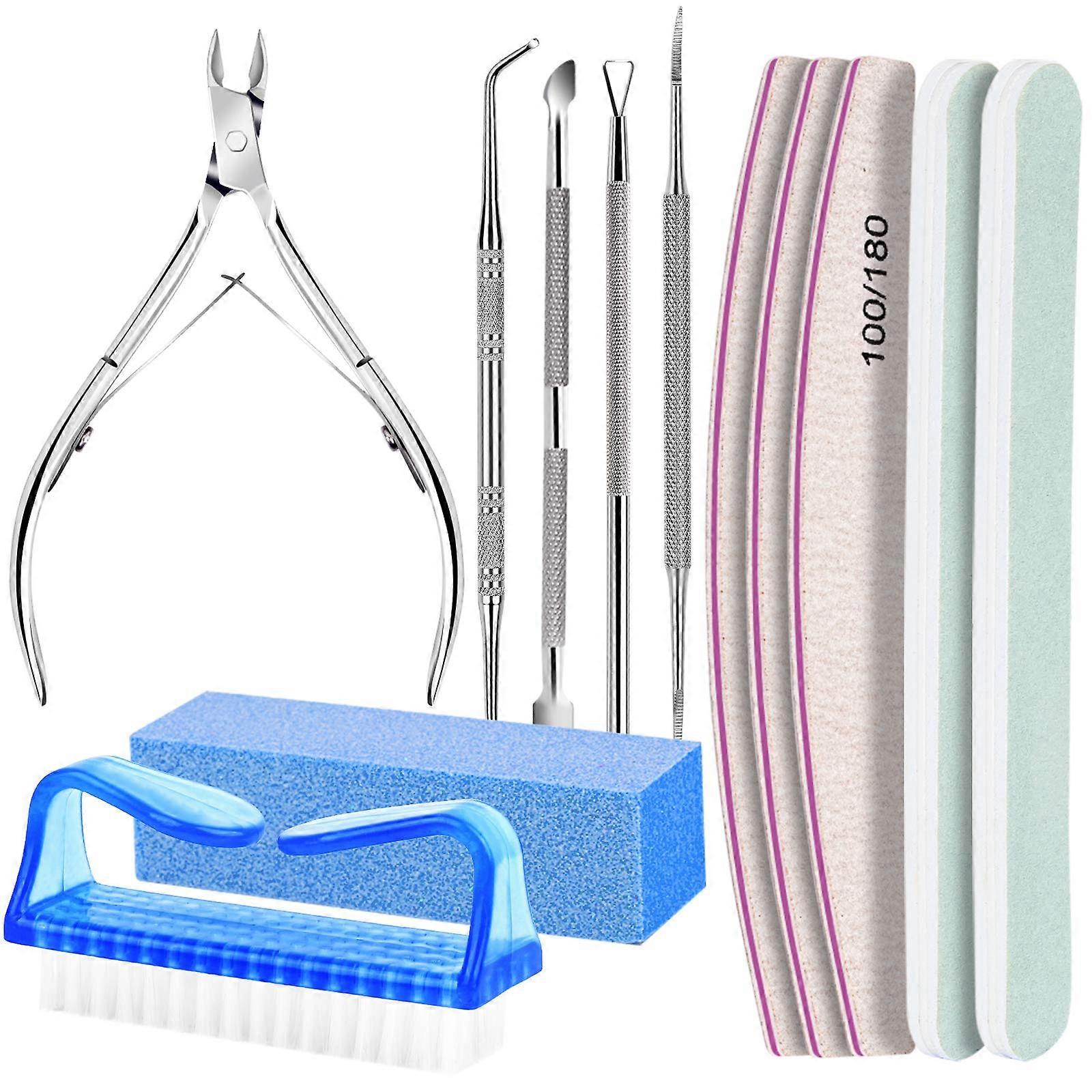 Info about this article Professional manicure & Pedicure set - scope of delivery: 3 pieces nail files 100/180, 2 pieces polishing files, 1 piece nail buffer block, 1 piece cuticle pusher, 1 piece triangular cuticle peeler, 1 piece stainless steel nail file, 1 piece corner lifter, 1 piece .Nail nippers, 1 piece nail brushWe offer a very large selection of professional, practical and durable manicure & Pedicure set to meet your needs! Practical tools for filing and polishing - The nail file with a grit of 100/180 has the plastic core and high-quality sand sheet for precise filing on the nail edges and for removal of modeling residues in the nail fold, are suitable for natural and acrylic nails. The buffer and polishing files have a rough grain that can shorten the length of your nail and polish your nails. The small nail brush can help brush the residue from the nails easily. Perfect nail care set -The double-sided cuticle pusher features a spoon-shaped tip and small tip to remove the extra cuticle on the nail and the dirt from the Remove the underside of the nail tip. The special triangular cuticle peeler can easily remove the dead cuticles and also remove the nail polish and nail gel. The nail clipper can easily and naturally remove the thick and deep cuticles of toenails and fingernails. Corner lifter and nail file for pedicure -The corner lifter can lift the nail corners to easily reach the nail edge and remove the stubborn deposits effortlessly. The nail file consists of a straight end for the outer surface of the nails and a curved end for filing the inner surface and nail edge to trim the corners of the nail. They help you get rid of the pain and discomfort caused by ingrown toenails. A complete tools set for you - Robust and wear-resistant, washable and reusable multiple times. Long-lasting professional tool set of the highest nail salon quality for manicure & Pedicure in your nail salon or at home. Features -Two-sided nail file with a grit of 100/180. The 100-grit nail file is coarse-grained and is suitable for removing nail gel and also for use on toenails. The 180-grit side is fine and can help cut the edge of the nails and refine the shapes. -The high-quality polishing files, the surface is finer than the other files to give you a comfortable experience Offer experience of manicure and pedicure. -The buffer has a rough grain, which can shorten the length of your nail and polish your nails. -The small nail brush can help the residue easy to brush from nails. -The cuticle pusher, cuticle peeler, nail file, corner lifter and nail nipper are made of high quality stainless steel, elegant and durable. -The cuticle pusher features a spoon-shaped tip, to remove extra cuticle on the nail. The other end consists of a small tip to be able to remove excess dirt from the bottom of the nail tip. -The special triangular design that fits the nail structure perfectly. Even on the most sensitive nail edges, it can easily remove the dead cuticles and also remove the nail polish and nail gel. -We offer an angled corner lifter. It can lift the nail corners to easily reach nail edge and remove the stubborn debris effortlessly. -Our nail file consists of a straight end for the outer surface of the nails and a curved end for filing the inner surface and Nail edge to trim the corners of the nail. Allow you to quickly and precisely shape your nails for an excellent pedicure! Attention Please keep the product away from children under 5 years. Please sterilize and clean the products with soap and water or alcohol before and after use, which are made of stainless steel. Please always be careful when using hard objects.