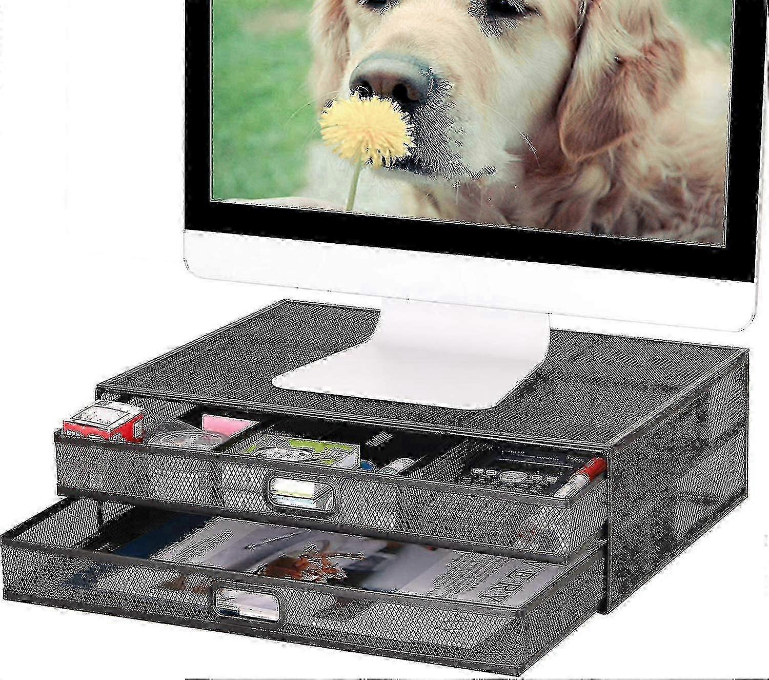 Monitor Stand Riser With Drawer Metal Mesh Desk Organizer With Dual Pull Out Storage Draw
