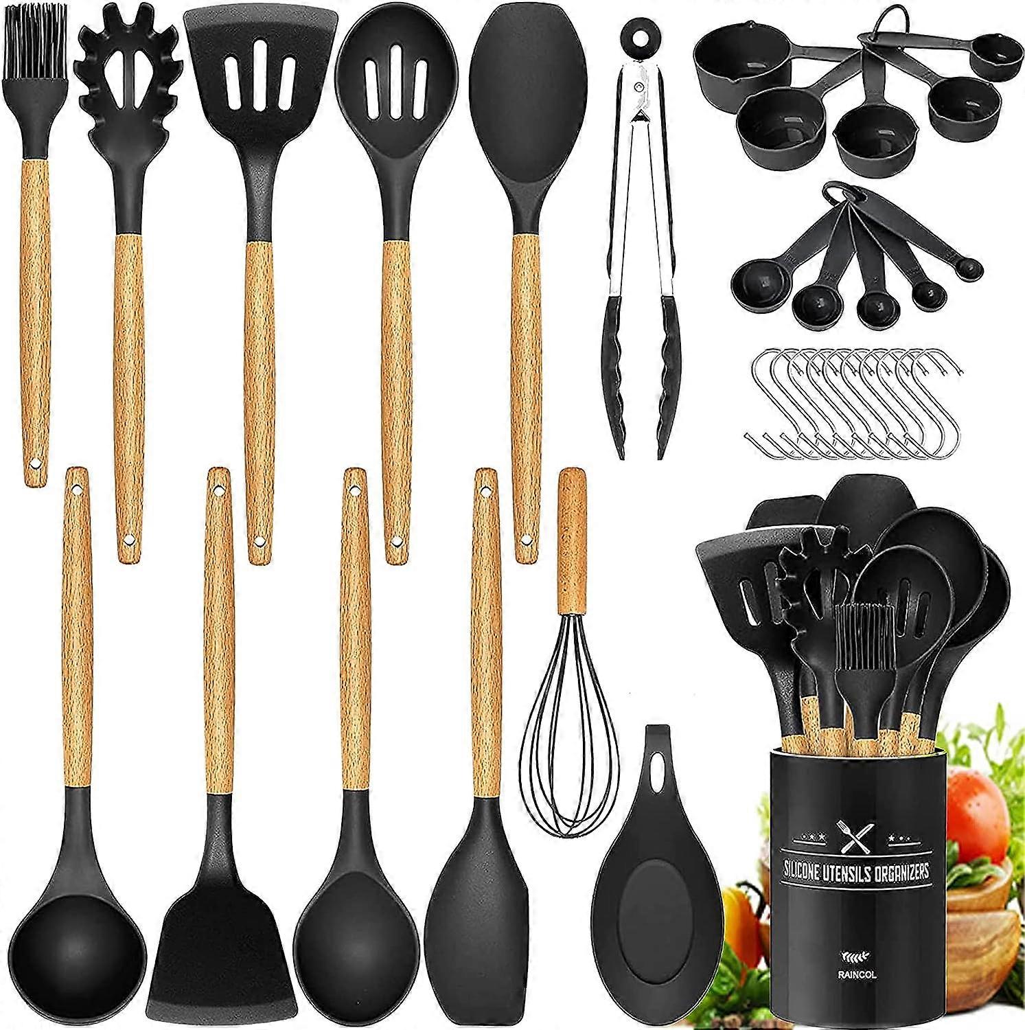 33 DURABLE WOODEN HANDEL KITCHEN UTENSILS SET -- Anti scalding protect your hand from burning, 33 professional silicon Kitchen utensil set include set includes flexible spatula, soup ladle,serving spoons, pasta server, spatula turner , tongs, 10 pcs hooks, silicone mat and so on. Meet your all kinds of kitchen needs and help you make the absolute best dishes.