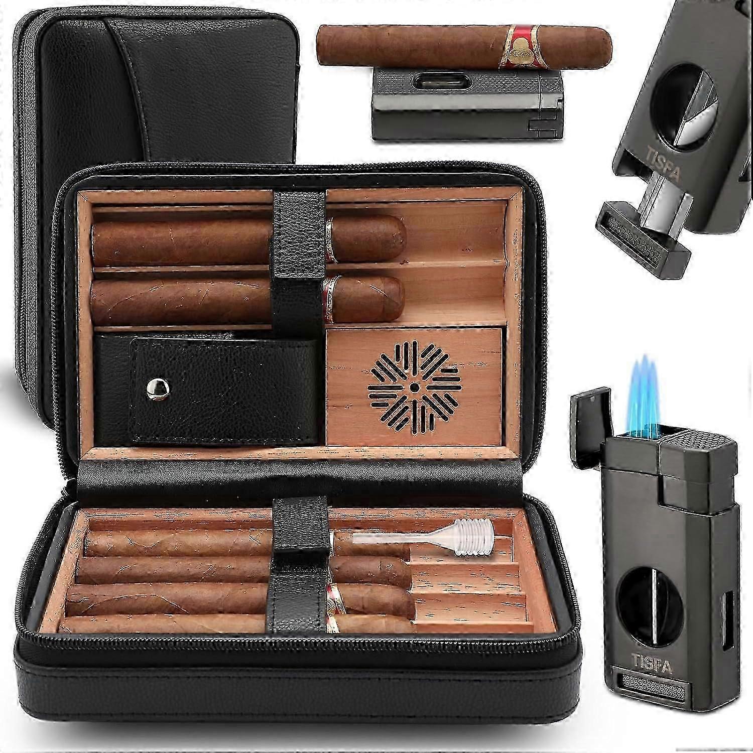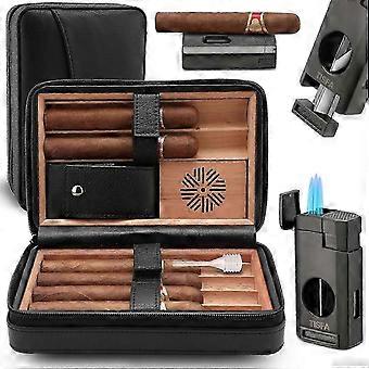 Cigar Humidor, Leather Cedar Wood Cigar Case With Cigar Lighter, V Cut Cigar Cutter, Cigar Holder 3 In 1, Portable Travel Cigar Humidor Box With Humid