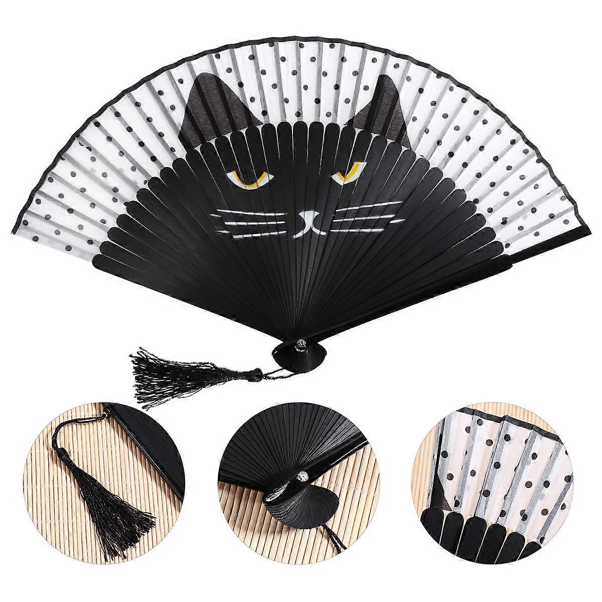 Collapsible Handheld Silk Fan Black Cartoon Cat Suitable For Weddings 21cm Folding Design Easy To Carry 1Pack