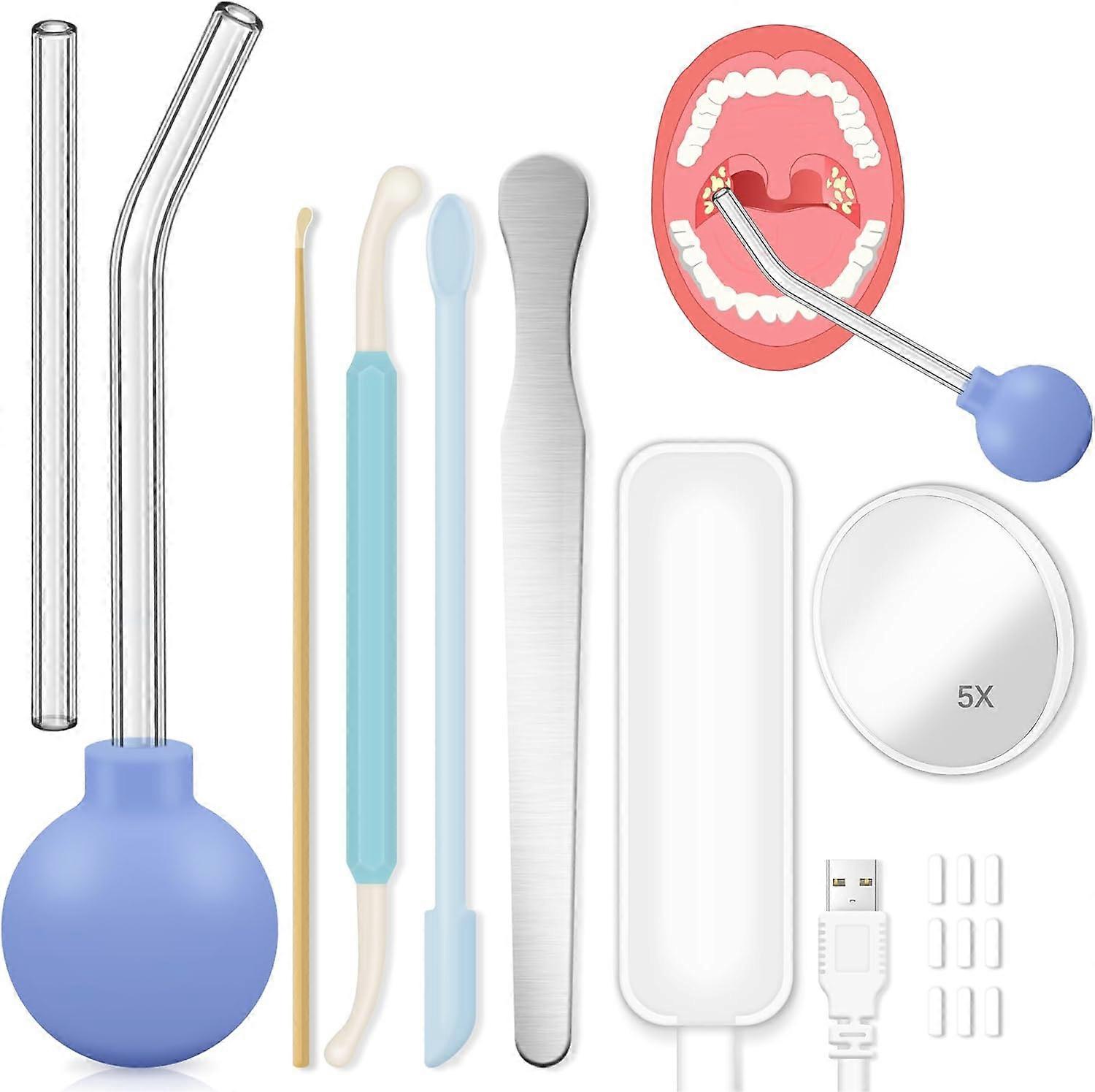 Tonsil Stone Remover Vacuum Tonsil Stone Removal Kit Tonsil Stone Cupping Tool with Tongue Depressor, 5X Magnifying Mirror, Oral Lamp - 9 Pieces