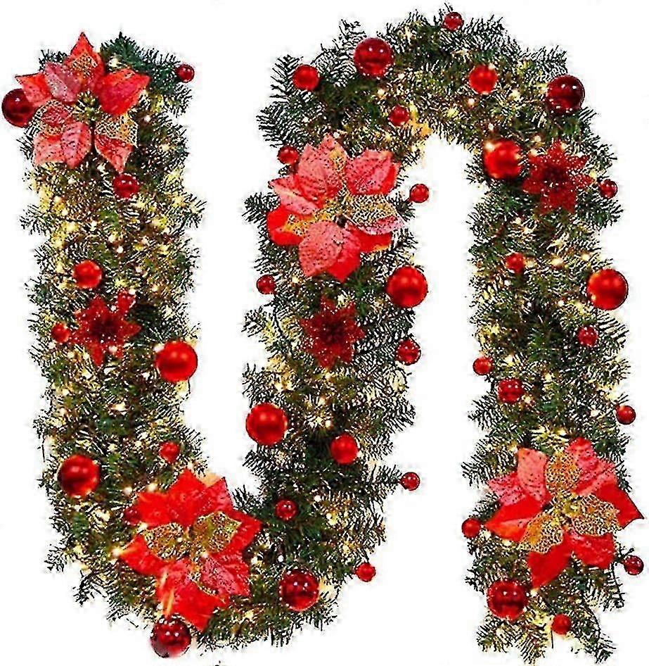 Decorated With Red Flower, Pre-lit Christmas Garland, Handcrafted And Durable, Indoor Outdoor Holiday Decoration, Christmas Atmosphere, 9 Ft Long For