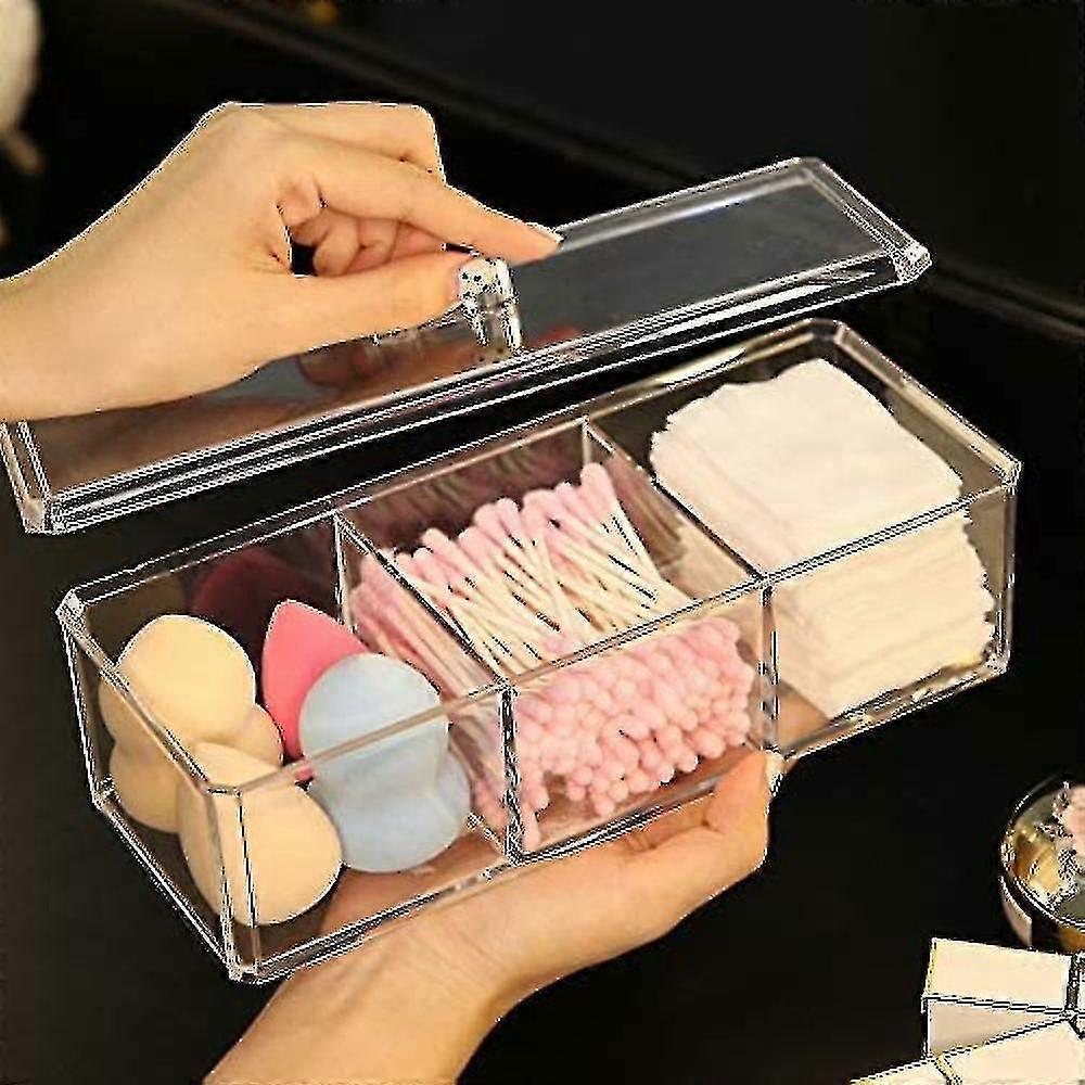 Rectangular Cotton Ball And Swab Holder Organizer With Lid, Dustproof, Waterproof, Clear 3 Compartment Cotton Pad Container, 1 Pack