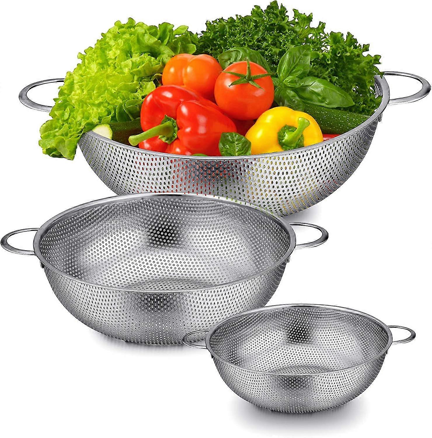 FOOD GRADE STAINLESS STEEL:Colanders are made of high quality rust-resistant stainless steel, Robust construction and wont break/bend, No chemical substances to affect the taste of your foods, 100% healthy and durable for years, Great replacement to other strainers . 1/3/5 QUART VARIOUS SIZES: Come with Acsergery 3 convenient size (1+3+5Quart) to satisfy all your kitchen cooking needs and nestable design take up less storage space, Ideal for both hot & cold foods, Perform well for washing fruit, draining pasta, rinsing veggies, straining beans, prepping meal . EFFICIENT MICRO-PERFORATIONS: Closely-spaced holes cover the whole surface for fast drainage and prevent small foods (Rice, Spaghetti, Nuts, Blueberries) from slipping through Well finished, Smooth surface without rough edges a pleasure to use, Definitely a must-have for any kitchen . TWIN HANDLES & FOOTED DESIGN: Double handles are firmly riveted to provide a comfortable grip, Convenient to hang on kitchen hook rack for space-saving storage Footed design for keeping food lifted to prevent backflow, Cleaning is a doddle and dishwasher friendly . MULTIFUNCTIONAL KITCHEN TOOLS: Our practical & versatile colander set would help you prepare food faster, easier and cleaner, Large Medium Small size - Help you tackle all kitchen jobs with Acsergery confidence, Not only best for home use also a great choice for restaurants, hotels, caravan and more .