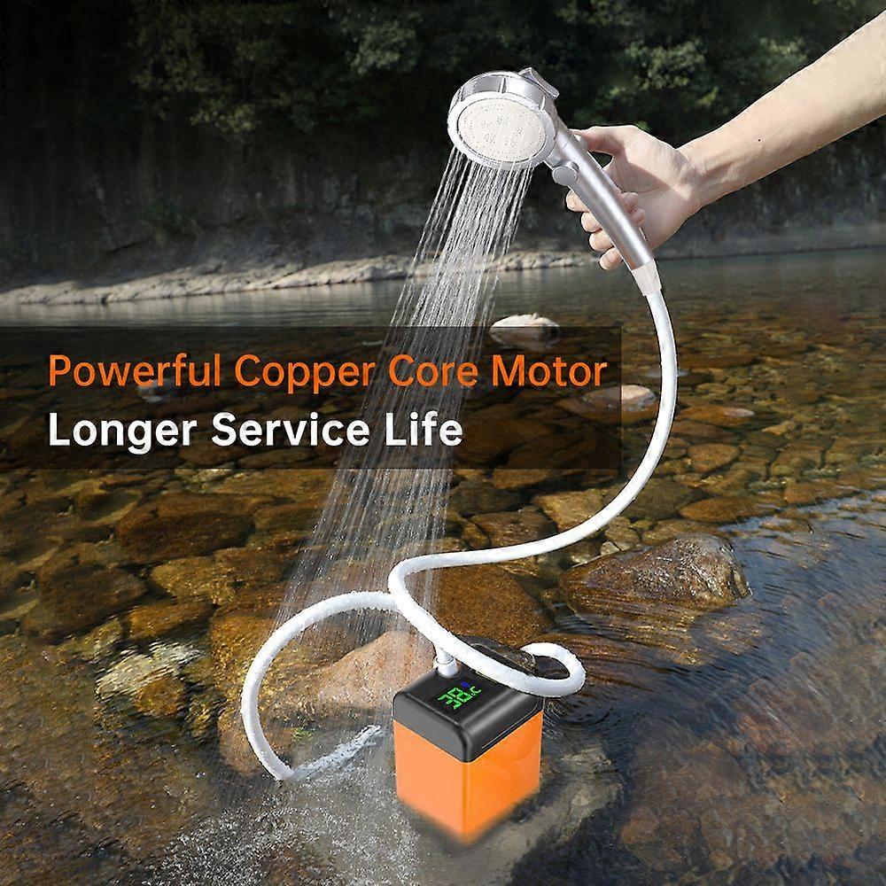 Feature:1. This device displays real-time water temperature ranging from 32-140F. The indicator light turns green for temperatures between 35-45, blue for temperatures below 35, and red for temperatures above 45.2. It displays real-time power levels with four battery indicators: 25%, 50%, 75%, and 100%.3. It also shows three water output levels.4. This portable shower head offers three water discharge modes and a one-button stop feature.5. The built-in 4800mAh lithium battery provides up to 100-110 minutes of use when fully charged, and can be powered via phone charger, power bank, or car USB output.6. Provided suction cup can fix the shower head on any smooth flat surface. Hook lets you hang the showerhead safely on trees for a convenient shower.7. Ideal for indoor/outdoor showers, camping, BBQ, hiking, travel, bathing kids, cleaning pets, washing cars, and watering plants.Specification:The portable outdoor shower pump runs, providing a powerful water suction effect when, at the same time, the use of a quiet structure design, bathing almost can not hear the sound.Features:This device displays real-time water temperature ranging from 32-140°F. The indicator light turns green for temperatures between 35-45, blue for temperatures below 35, and red for temperatures above 45.It displays real-time power levels with four battery indicators: 25%, 50%, 75%, and 100%. It also shows three water output levels. This portable shower head offers three water discharge modes and a one-button stop feature. The built-in 4800mAh lithium battery provides up to 100-110 minutes of use when fully charged, and can be powered via phone charger, power bank, or car USB output.Provided suction cup can fix the shower head on any smooth flat surface. Hook lets you hang the showerhead safely on trees for a convenient shower.Ideal for indoor/outdoor showers, camping, BBQ, hiking, travel, bathing kids, cleaning pets, washing cars, and watering plants.Note: Shower head water outlet pattern is random. The color of suction cup mount and bath ball and USB cable are random.Specifications:Material: PlasticWorking time: 100-110 minBattery capacity: 4800mAhSize: 23*13*16cm/ 9.1*5.1*6.3in Weight: 950g/ 33.5ozPackage list:1 * shower pump1 * sticky hook1 * suction cup mount1 * three gear switch shower head1 * bath ball1 * USB data cable1 * explosion-proof hose (2m)Package List:1 * shower pump1 * sticky hook1 * suction cup mount1 * three gear switch shower head1 * bath ball1 * USB data cable1 * explosion-proof hose (2m)