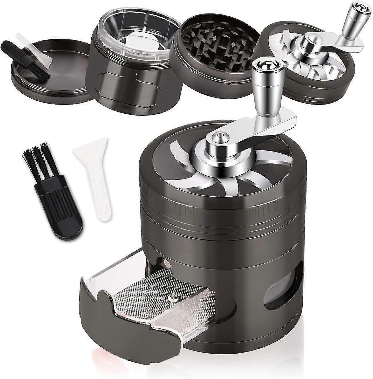 Hand Crank Herb Grinder, 2.5 Inch Large Capacity Spice Grinder with Handle, Magnetic Lid, 4-Piece Zinc Alloy Grinder with Drawer & Pollen Collector