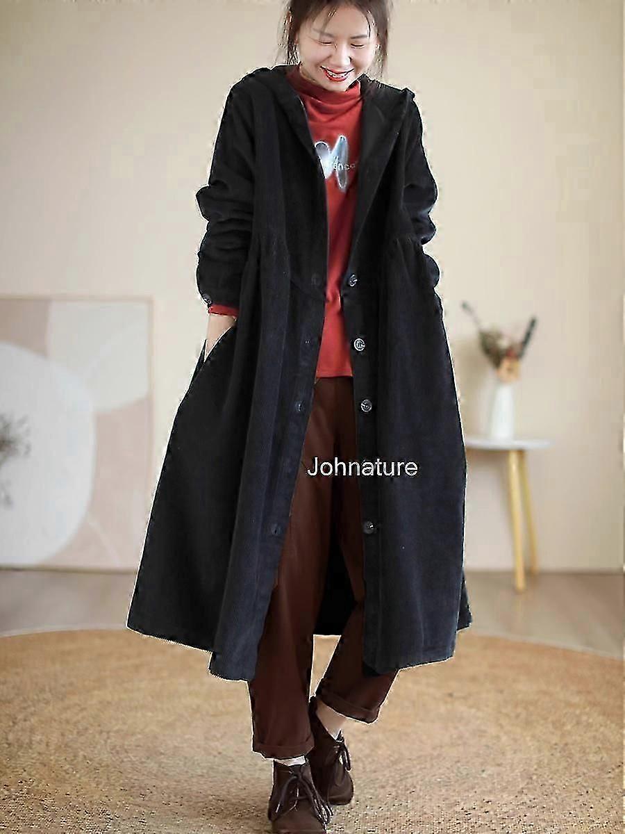 Vintage Women's Corduroy Hooded Trench Coat with Long Sleeves