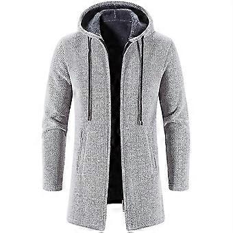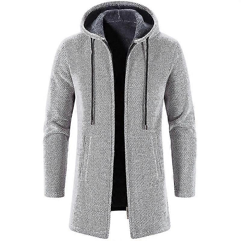 Warm Mid-length Hooded Fleece Coat, Men's Comfortable Solid Color Zip Up Knitted Cardigan