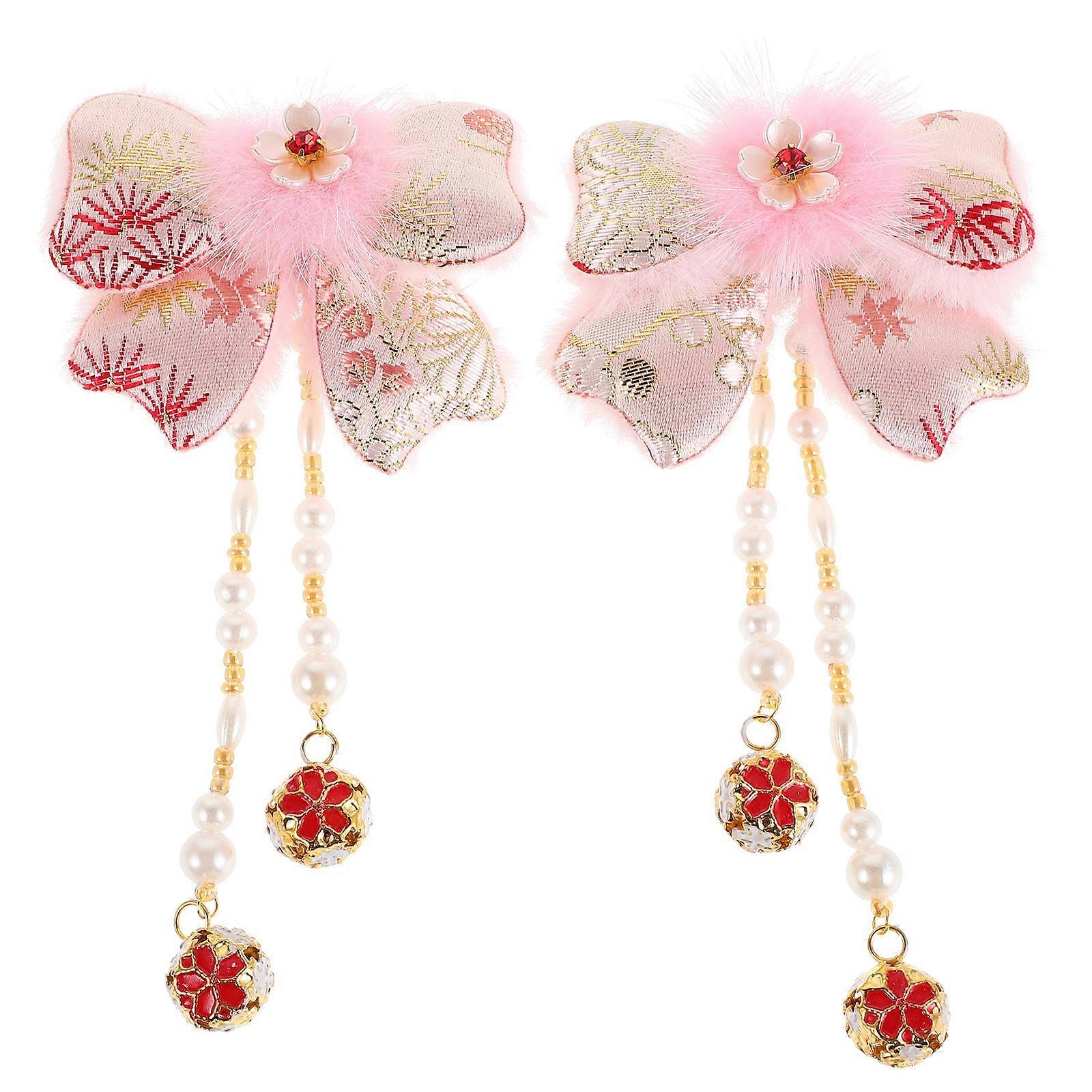 Cute Bow Hair Clips For Baby Girls Traditional Chinese Style Hanfu Outfits Pink Fluffy Accessory With Pearls 2Pcs