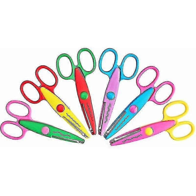 Children's scissors, set of 6 children's scissors, serrated children's scissors, serrated scissorsThe product includes 6 children's scissors in different colors and textures, each measuring 13.5 cm and 23 g .The scissors consist of stainless steel blades and plastic handles. The blades of the scissors are domed and covered with a plastic case, which is safe for children and not easy to cut.Each scissor can cut different shapes, including large waves, small waves , large serrations, small serrations, stamp gears and castles. Different shapes can stimulate children's imagination and creativity.Each pair of scissors has a different color, which can interest children in manual work and quickly identify the shape of the scissors. Please note that the scissors are not suitable for children under 3 years old!Wide application: the scissors are suitable for craft training for teachers, students and preschoolers. You can use it for DIY scrapbooks, photo albums, cards and children's art.The product includes 6 children's scissors in different colors and textures, each measuring 13.5 cm and 23 g. The scissors consist of stainless steel blades and plastic handles. The blades of the scissors are domed and covered with a plastic casing, which is safe for children and difficult to cut. Each chisel can cut different shapes, including large waves, small waves, large serrations, small serrations, stamp gears, and castles. Different shapes can stimulate children's imagination and creativity. Each pair of scissors has a different color, which can interest children in manual work and quickly identify the shape of the scissors. Please note that the scissors are not suitable for children under 3 years old! Wide Application: The scissors are suitable for craft training for teachers, students and preschoolers. You can use it for craft scrapbooks, photo albums, cards and children's art.