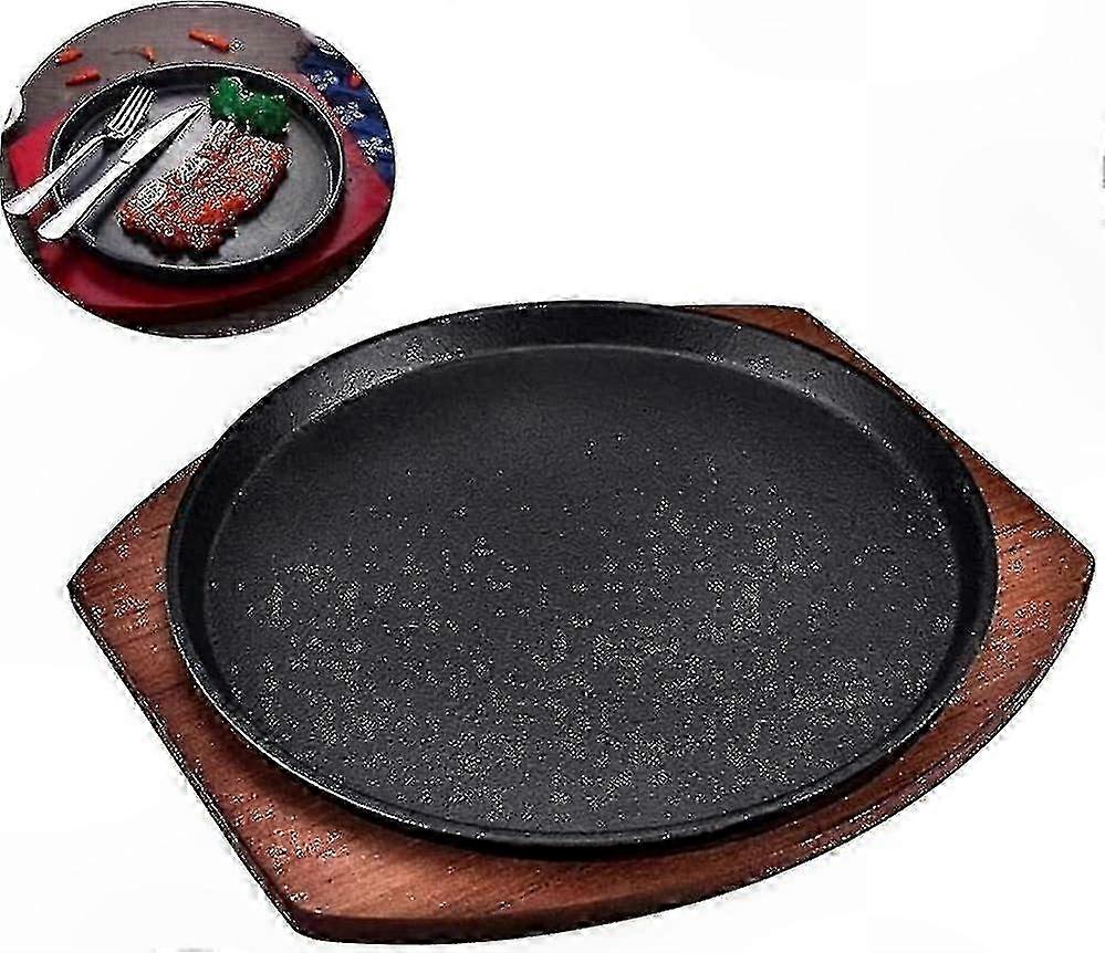 Round Cast Iron Pizza Pan with Wooden Serving Board, Multi-Functional Hot Dish for Teppanyaki and Steak Servings