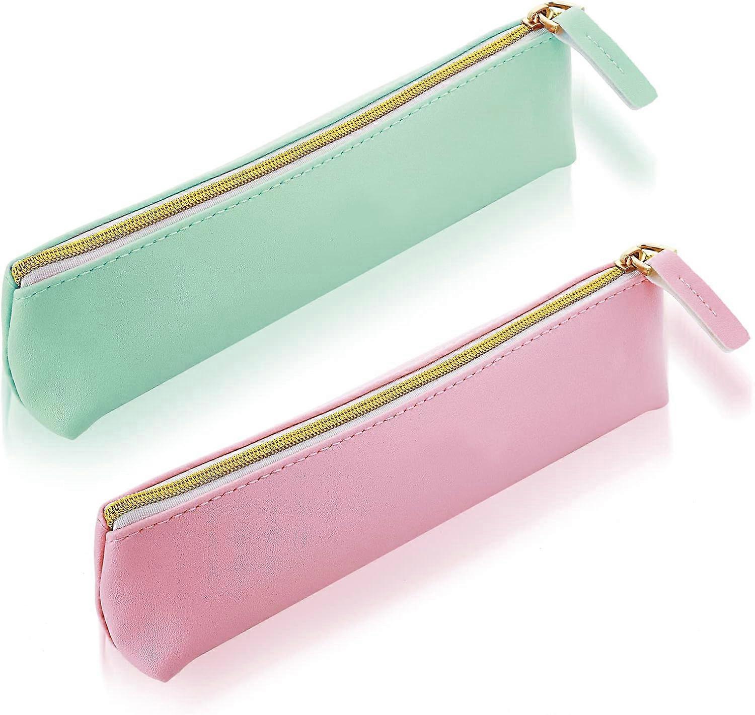 Leather Pen Pencil Case, 2PCS Cute Slim Pen Bag Small Pencil Pouch Lovely Stationery Bag Portable Cosmetic Bag Zipper Bag for Pen Pencils Markers(Gree