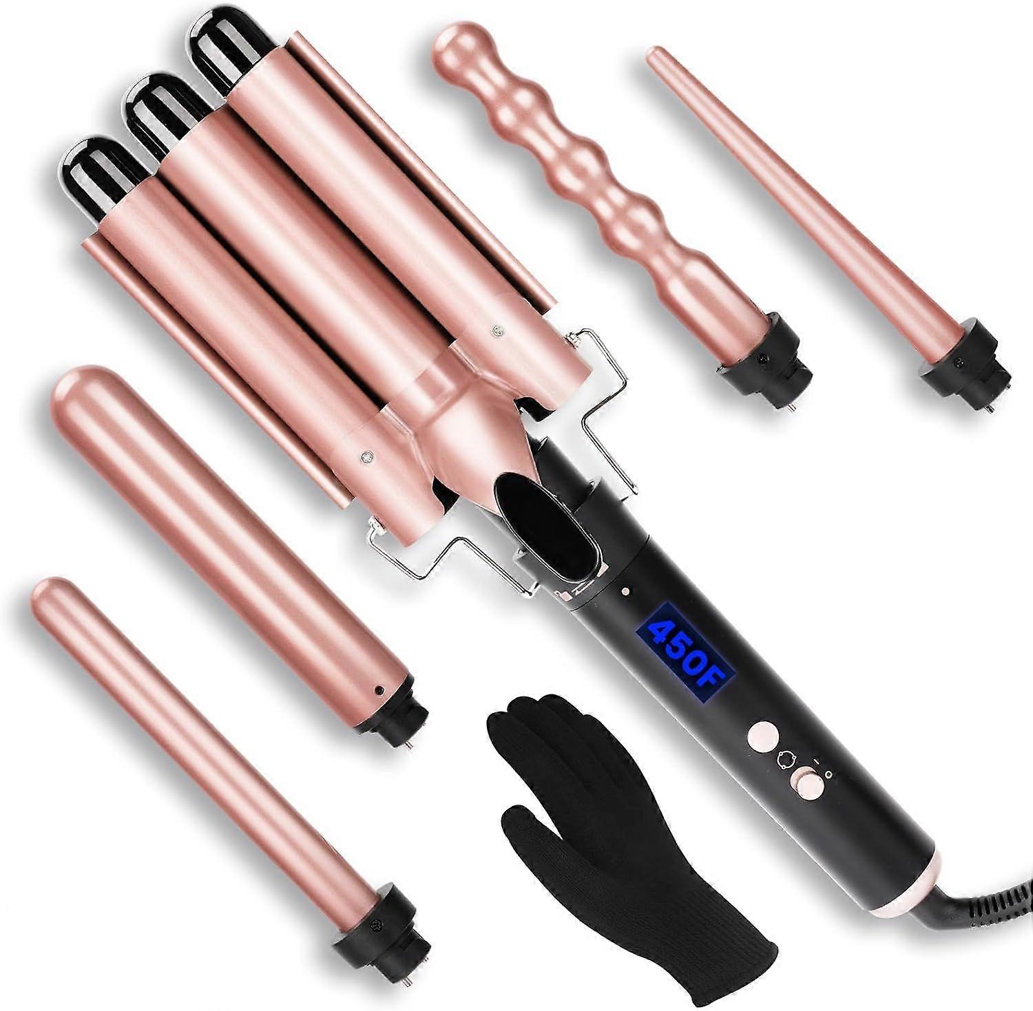 5 IN 1 CURLING WAND SET: The curling iron set includes: 0.64-0.95 inch bubble curling wand; 0.98 inch 3-tube curling iron; 0.75 inch small curling iron; 1.25 inch large curling iron; 0.43-0.7 inch tapered barrel curling iron. TEMPERATURE VISUALIZATION Our curling iron comes with a temperature display that provides 4 temperature options, 320, 360, 400 and 450, which can be adjusted to the proper temperature according to your needs. FAST HEATINGOur curling iron with PTC heating technology takes only 30 seconds to heat up to the target temperature, making hairdressing less waiting. SAFE TO USE100% tourmaline ceramic can nourish hair, keep shine and reduce frizz. The swivel clasp makes the curling iron more tightly fixed to the handle to avoid falling off during use. BEST GIFTThis 5-in-1 curling iron set can meet the needs of daily hair styling, it is the best gift for your girlfriend, wife and female friends!