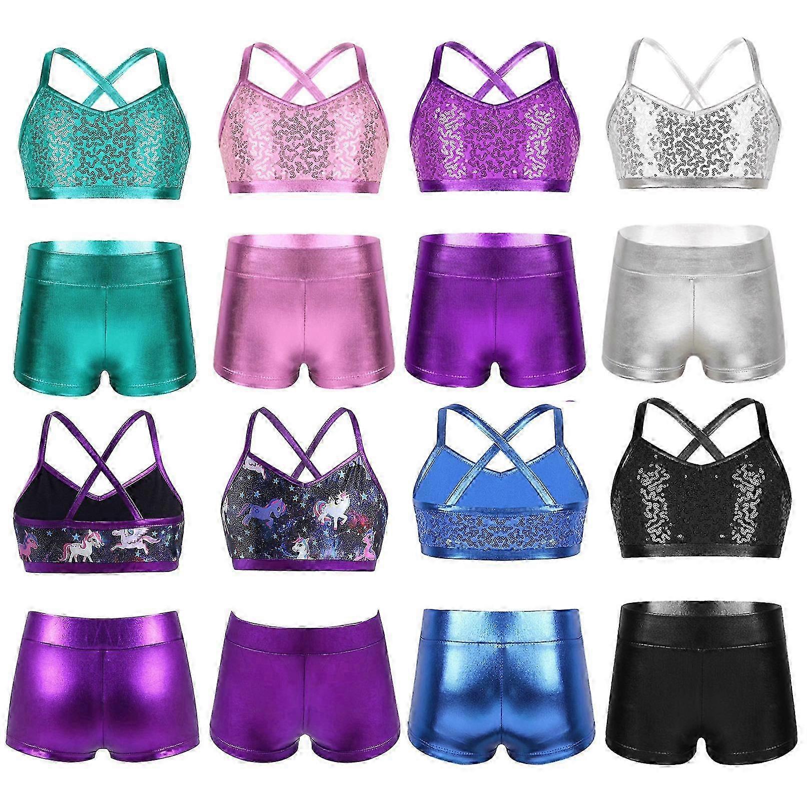 Girls Gymnastics Outfit with Sequin Crop Top and Athletic Shorts for Dance and Ballet Practice Sets