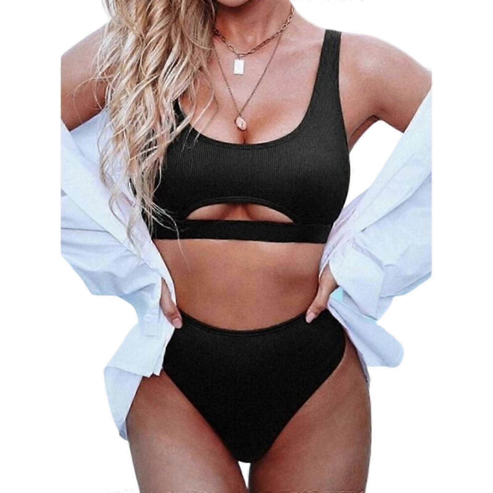 High Waisted Two Pieces Swimsuits for Women Sexy Cut out Bathing Suit High Cut Swimwear Crop Top Bikinis Set Beachwear light blue L