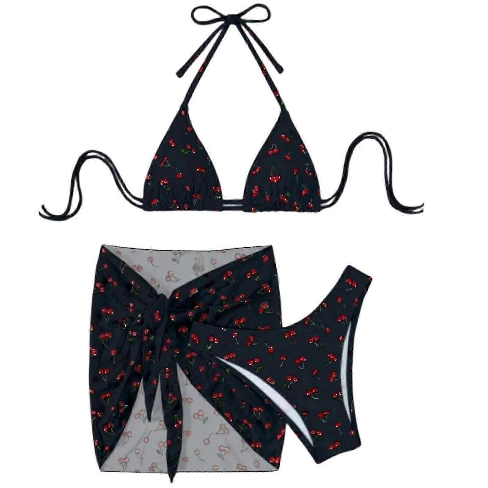 Women Two Pieces Swimsuit with Bathing Suit Wrap, Halterneck Swimming Costume with Beach Wrap Skirt, Print Swimwear White L