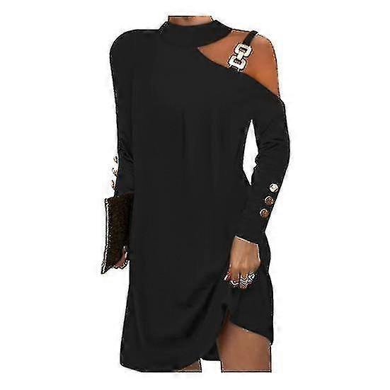 Women Dress Chain Decor One Shoulder Long Sleeve Solid Color Loose Halter Neck Soft Breathable Above Knee Length Mini Dress