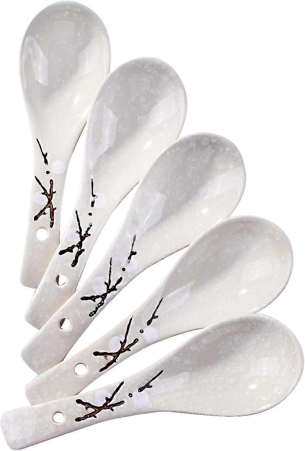 Japanese Soup Spoons, White Plum Ceramic Spoons Set Of 5 Serving For Soup, Wonton, Oat, Gravy