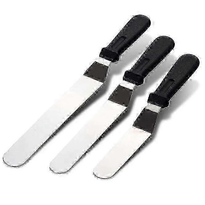 Angled Patisserie Spatula - Features flexible yet sturdy stainless steel blades that provide optimal durability for years of use. Icing Spatula - Designed with plastic handles for a secure grip, comfort and control while you glaze and decorate. Angled Pastry Spatula - Perfect material to have direct contact with food, ease of use, safety and non-toxic, does not no smell. Strong and durable, has smooth surface, easy to clean. Bent Patisserie Spatula - Set of 3 cake knives in different lengths, 6 inch, 8 inch, 10 inch, which is ideal for baking, cookies, pancakes, pies and cupcakes. Cake decorating can be so easy with the right size. Cake spatulas help spread cream flat and evenly on cakes with the stable and smooth surface. The plastic handle is angled at 45 to the blade, which leads to more comfortable handling and even coating and spreading of cakes.